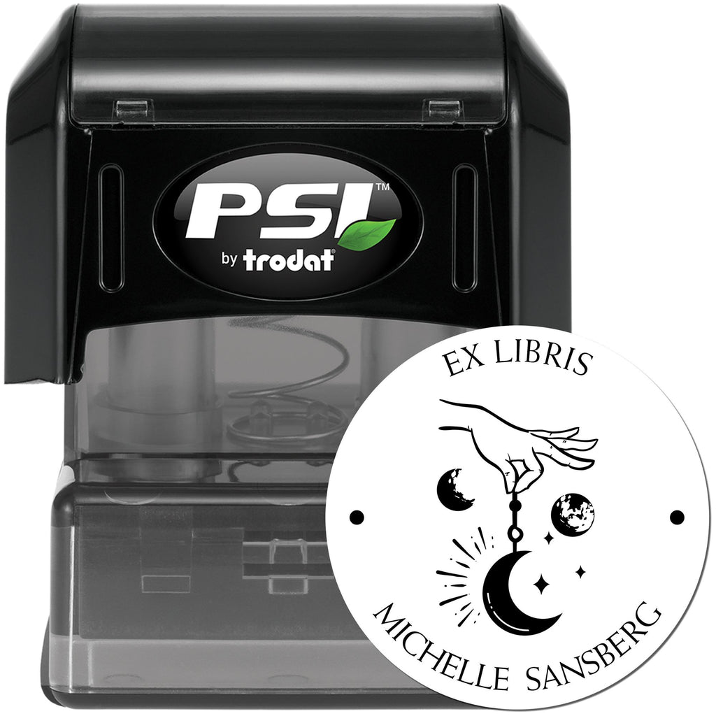 The PSI Pre-Inked Hypnotic Sky stamp features a mesmerizing design that captures the imagination. With a center image of a hypnotic sky, a hand dangling a half moon, and surrounded by planets and stars, this stamp is as enchanting as the books it will personalize. The clean round design includes phrases such as "This Book Belongs To," "From The Library of," and "Ex Libris" at the top arc, followed by your name or a special saying at the bottom arc, separated by two elegant dots. The impression size is a perfect 1-5/8" in diameter, making it ideal for bookplates and labels.
