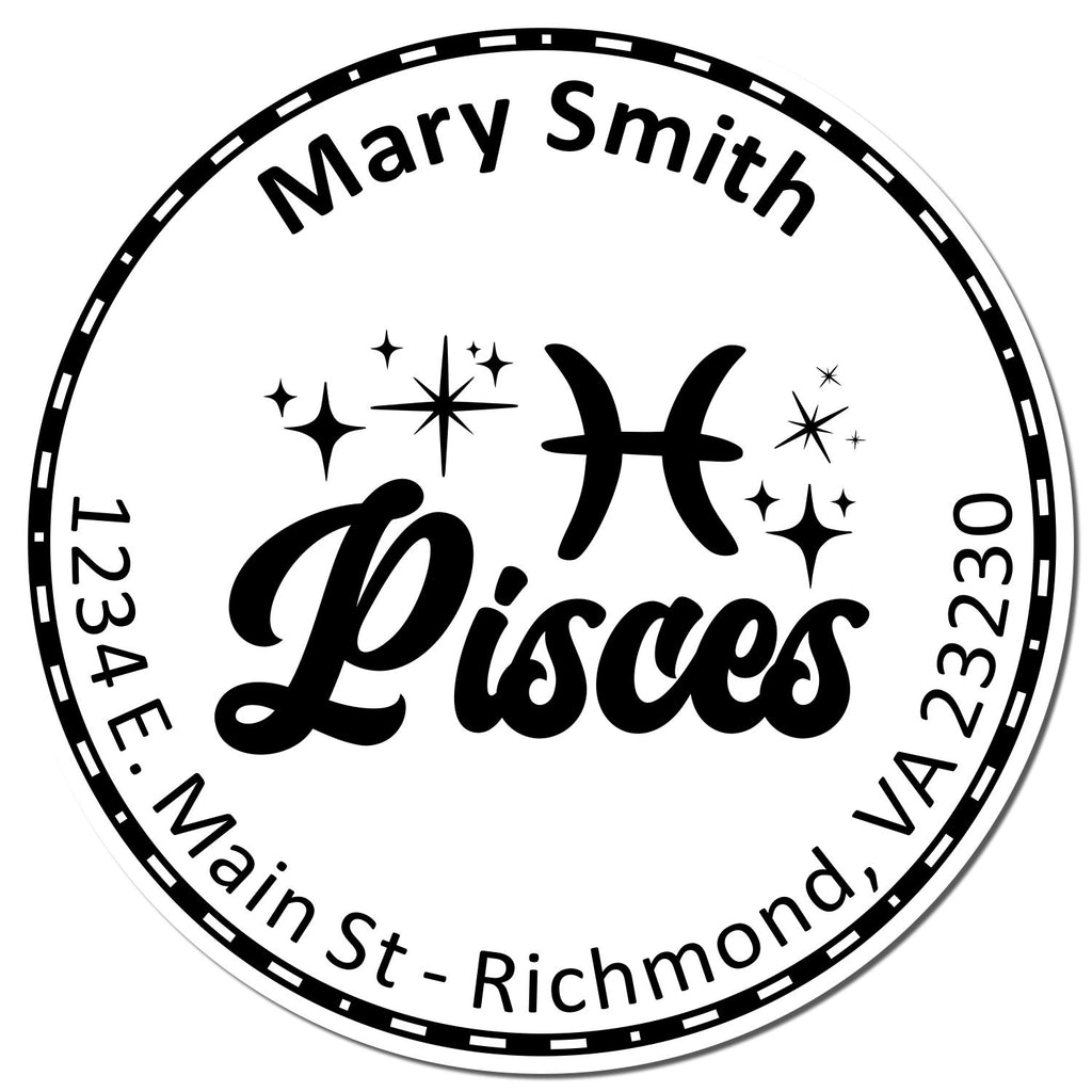 A Professional Touch With a diameter of 1-5/8", this stamp features a stunning design that includes your name elegantly arched at the top and your address or a special saying at the bottom arc, all framed by a solid circle border adorned with charming white dashes and dots. The scripted font for the word "Pisces" adds a touch of sophistication, ensuring that your mail not only looks neat and uniform but also reflects your personal style.