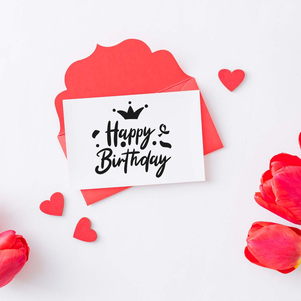 - Creative: Bold black “Happy Birthday” calligraphy with crown and confetti elements adds contemporary, festive flair to birthday cards, albums, and retail displays.