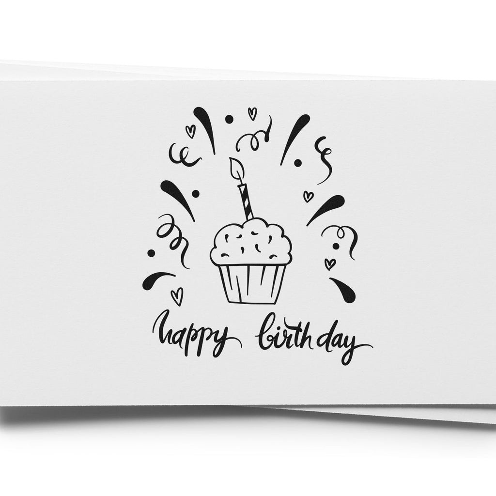 This black-and-white, hand-drawn cupcake features frosted sweetness, a glowing striped candle, swirling confetti, scattered dots, and delicate hearts, finished with elegant “happy birthday” script — a timeless, artisanal focal point that scales beautifully across cards, tags, invitations, and party favors.