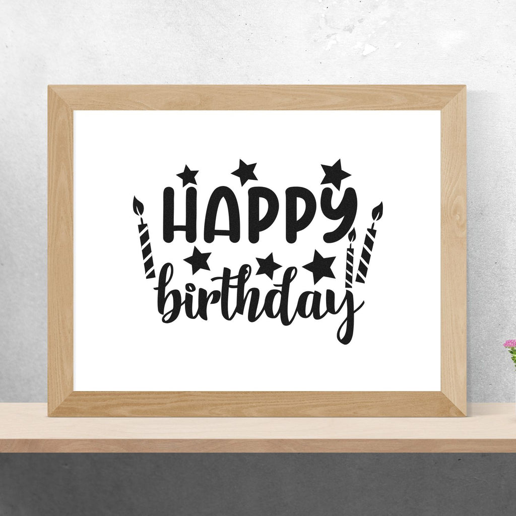 The clean black-and-white birthday graphic features bold, playful lettering, sleek star accents, and striped candles with tiny flames — high-contrast, minimalist, and instantly eye-catching for printable cards, social posts, stickers, banners, and thumbnails.