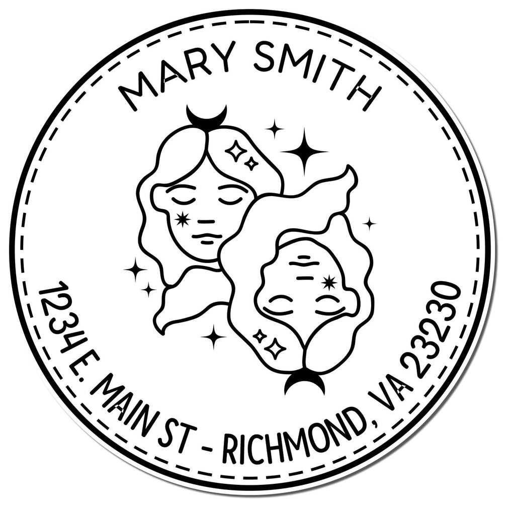 Stylish Design for the Modern Home The design of the Witty Gemini Custom Home Stamp is as charming as it is functional. Featuring the Gemini zodiac symbol, this stamp showcases twins with half moon and star images, beautifully encircled by a double ring border. Your name elegantly arcs at the top, while your address or a personalized message completes the bottom arc. With an impression size of 1-5/8" in diameter, this stamp is the perfect size for envelopes, labels, and more, ensuring your correspondence is both stylish and organized.