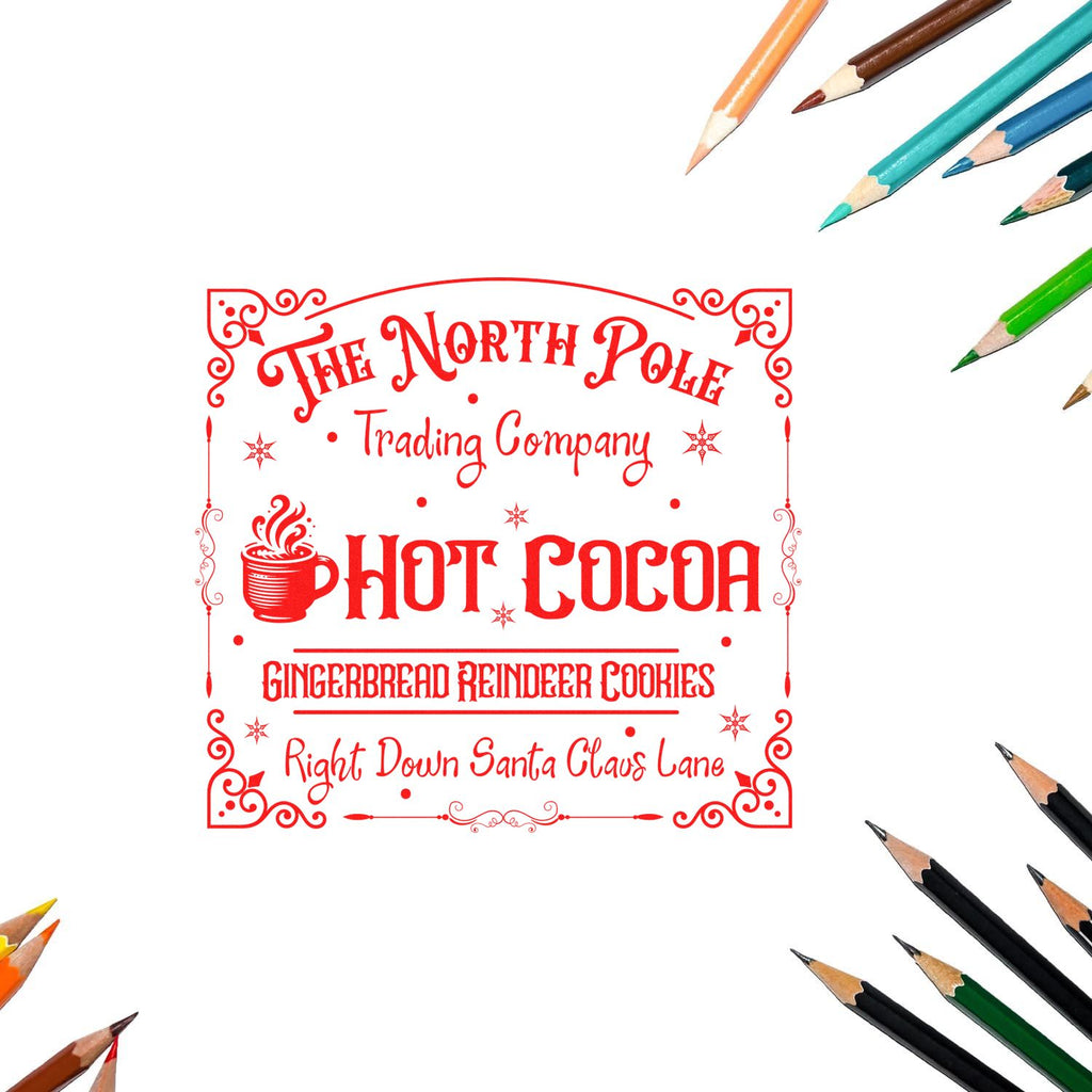 Enliven your holiday hustle with our Self-Inking Christmas Sign Mini Card Stamp—an artisan-made 1-5/8" square that turns every press into a cozy, vintage storefront moment: North Pole Trading Co. Headlines, elegant corner flourishes, delicate snowflakes, a steaming mug spotlighting bold HOT COCOA, a wink to Gingerbread Reindeer Cookies, and the cheerful cue Right Down Santa Claus Lane.