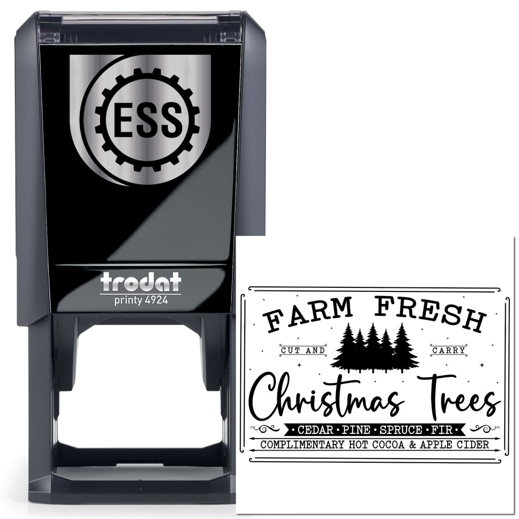 At 1-5/8 square, the artwork channels a charming vintage black-and-white sign: “Hand-Cut, Take-Home Christmas Trees” nestled above a cluster of evergreens—cedar, pine, spruce, and fir—each trimmed with decorative flourishes that whisper nostalgia and twinkle-light magic.
