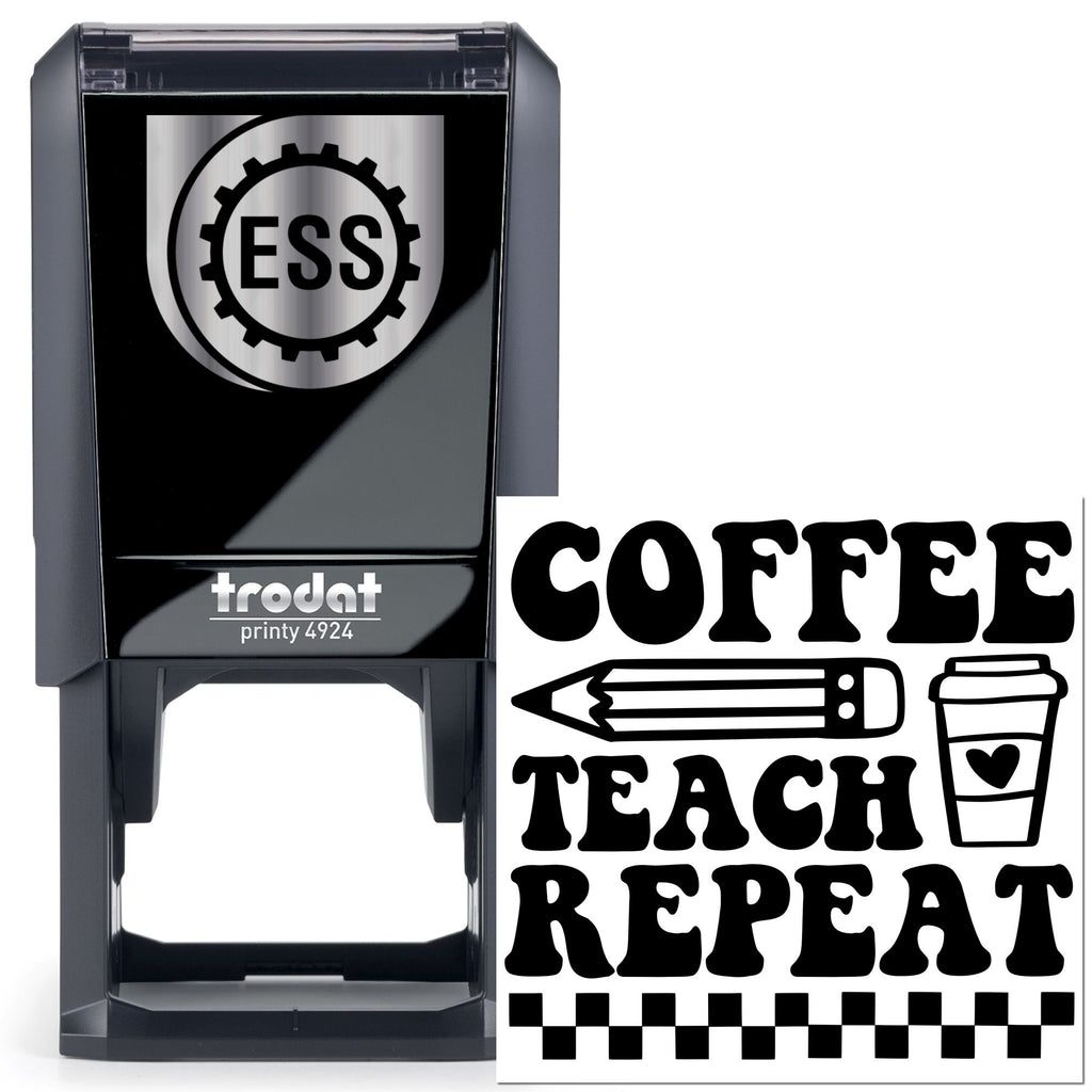 Sized at a tidy 1-5/8" square, the design pops: bold black type with COFFEE at the top, TEACH centered, REPEAT below; a sleek pencil under “COFFEE,” a takeaway cup with a heart for warmth, and a modern row of alternating squares along the base for a polished finish.