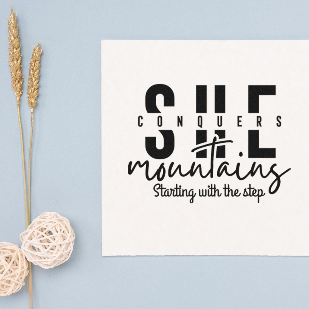 Knit the spirit of the trail into every project with the Self-Inking “Conquer Mountains” Cardmaking Stamp—a 1-5/8 Square powerhouse that prints a bold, typographic anthem: giant block letters declare “SHE,” the word “conquers” cuts confidently through the center, and an elegant script finishes with “mountains,” grounded by the handwritten promise, “Starting with the step.” It’s courage on a press—made for makers who move.