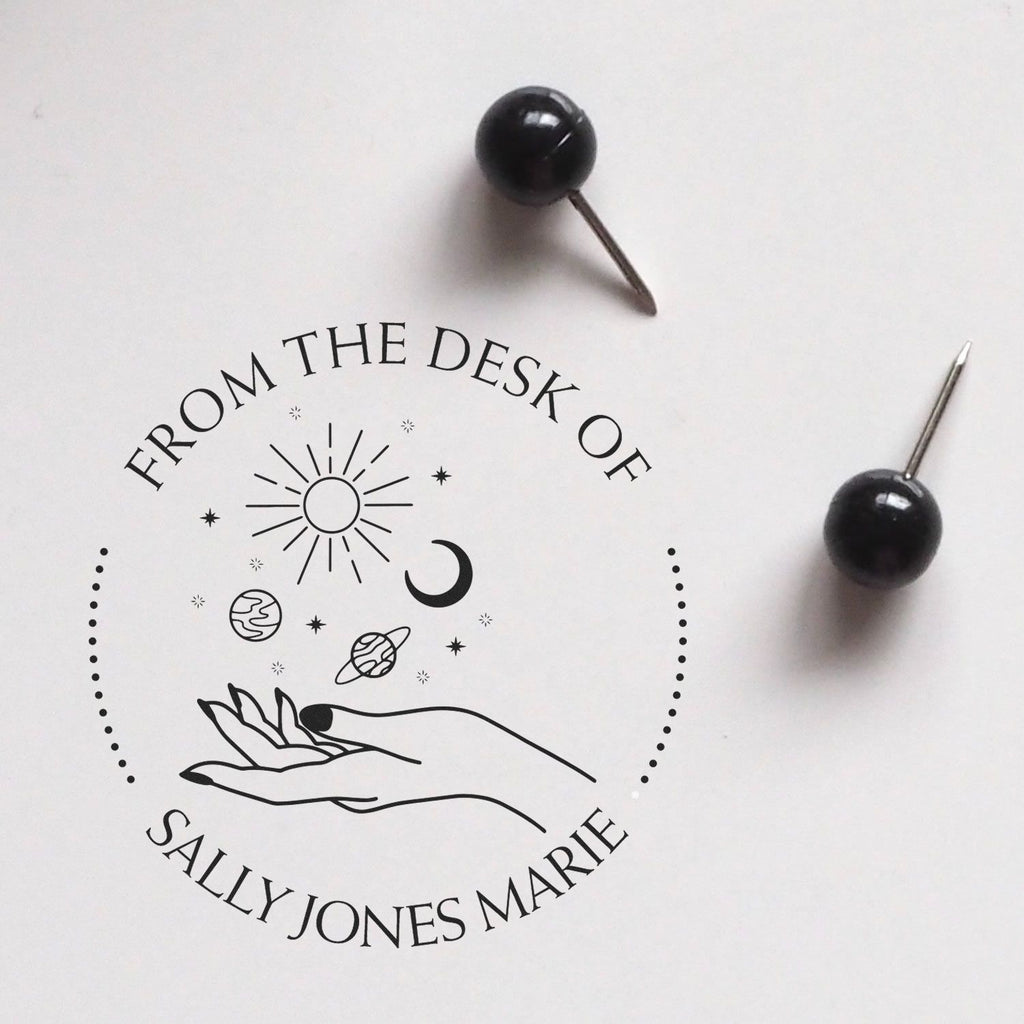 - ELEGANT DESIGN ELEMENTS: Showcase your literary passion with the celestial-themed artwork featuring hands holding planets, sun, and moon. Customizable top and bottom text arcs separated by decorative dot patterns create a sophisticated look.