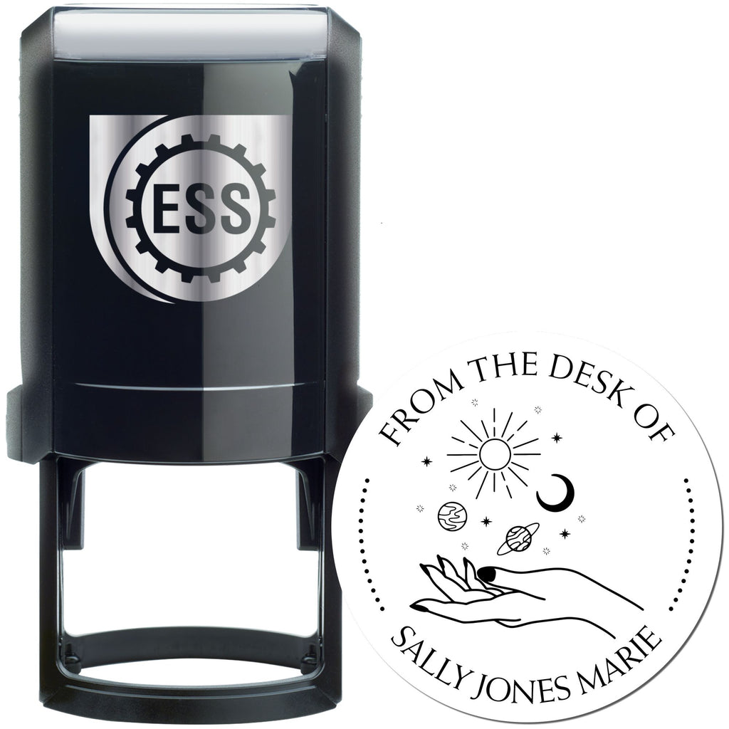 Introducing the Self-Inking Effervescent Nebulous Customized Book Ownership Label Stamper – the ultimate tool for avid book collectors! This exquisite stamp not only marks your books with a personal touch but also adds a dash of elegance to your library. Featuring a stunning design of an Effervescent Nebulous with hands cradling the planets, sun, and moon, this stamp is a true reflection of your passion for reading. With phrases like "This Book Belongs To" and "From The Library of" elegantly displayed, you can customize it with your name or a personal saying, making it uniquely yours. The impression size is a perfect 1-5/8" in diameter, ensuring your ownership is clear and stylish.