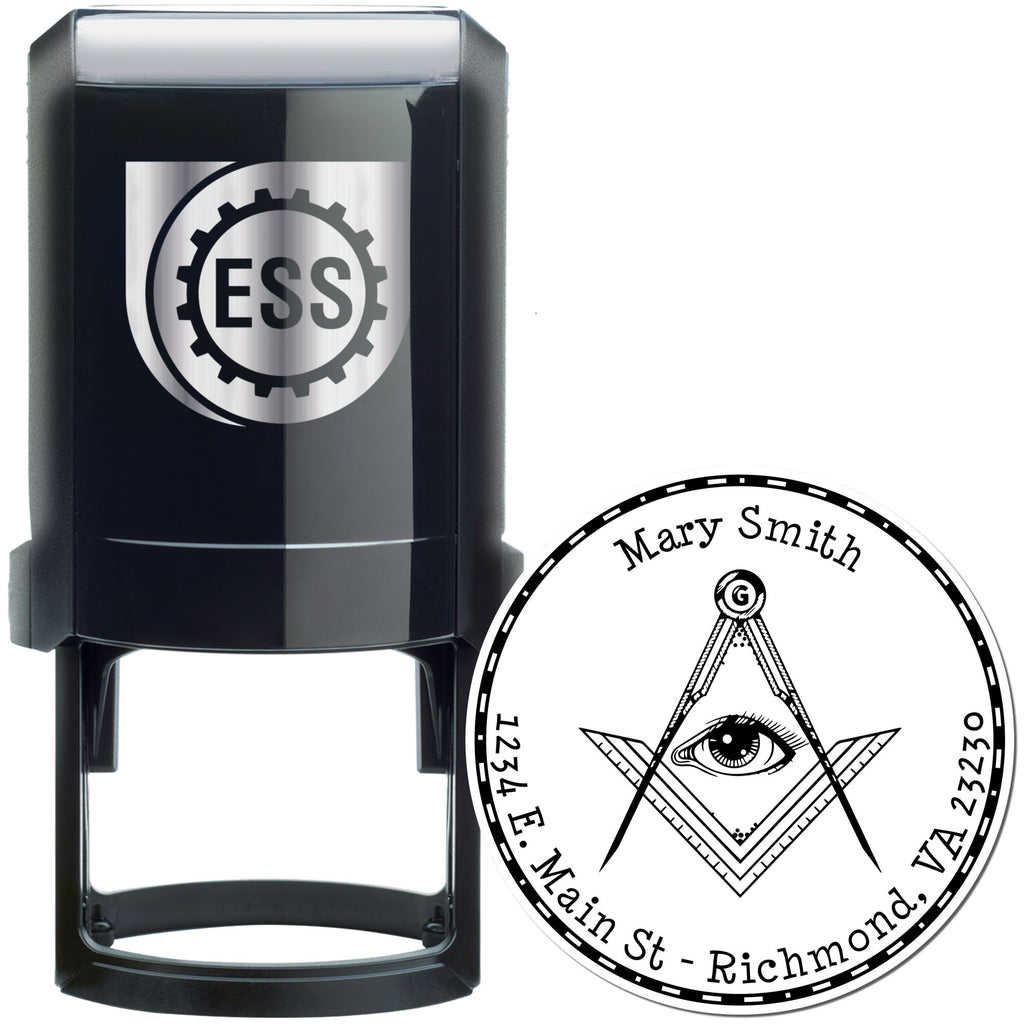 Elevate your correspondence with our Self-Inking Enlightening Masons Custom Home Address Stamp! This premium personalized mail stamper is designed for homeowners who value both style and efficiency in their home decor and correspondence. With a crisp impression size of 1-5/8" in diameter, this stamp features a stunning Enlightening Masons symbol at its center, surrounded by a chic circle border adorned with white dashes and dots. Your name elegantly arcs at the top, while your address or a custom saying completes the design at the bottom.