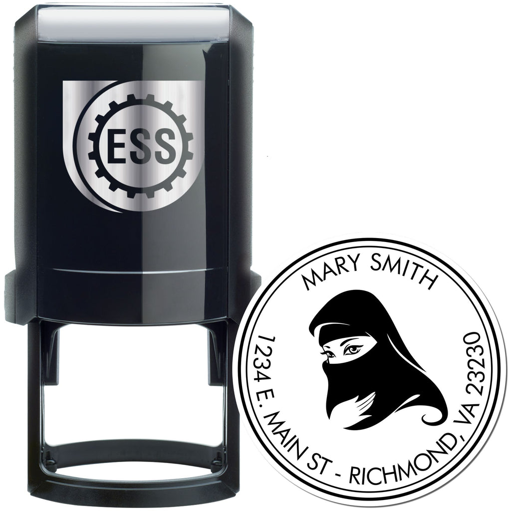 Elevate your correspondence with our Self-Inking Eye-catching Veil Custom Address Stamp! Perfect for newly engaged couples planning their wedding invitations, this personalized name and address stamper combines elegance with efficiency. Featuring a stunning design of a woman in a veil, encircled by a double concentric solid circular border, your name and address are beautifully displayed in a crisp, clear impression measuring 1-5/8" in diameter.