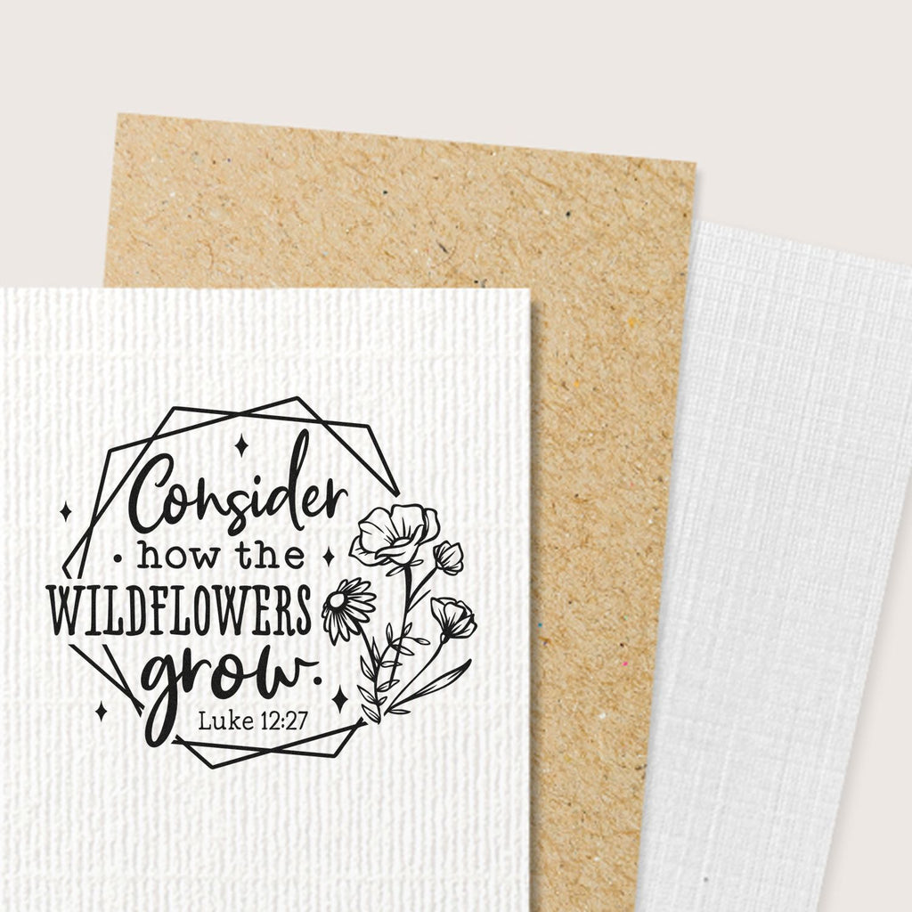 Framed in a crisp black line-art border, the 1-5/8" square design centers the uplifting phrase “Consider how the wildflowers grow” in a striking mix of flowing script and bold uppercase lettering, surrounded by hand-drawn blossoms, trailing foliage, and delicate starburst accents that add quiet magic to every impression.