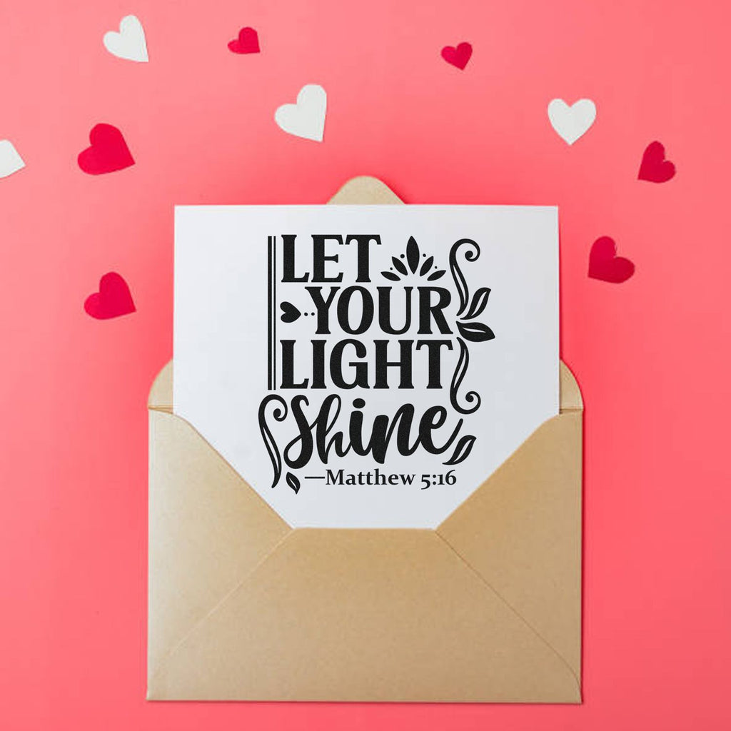 Engineered with advanced laser engraving, this 1-5/8" square stamp delivers sharp, consistent impressions that look like they were carefully hand-lettered every single time. Bold black type proclaims LET YOUR LIGHT SHINE, framed by graceful leaf and scroll details, with a subtle nod to Matthew 5:16 at the base. On a clean white postcard or tag, it pops instantly—equal parts modern, meaningful, and memorable.