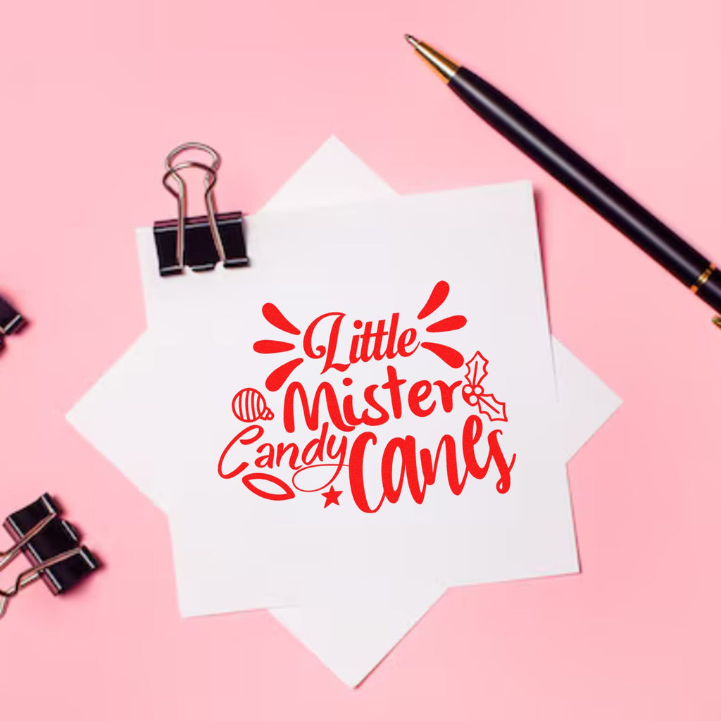 Bring the holidays to life with our “Little Mister Candy Canes” artwork—hand-lettered cheer framed by a striped ornament, holly, star, and playful splashes—striking in crisp linework that pops on any project.