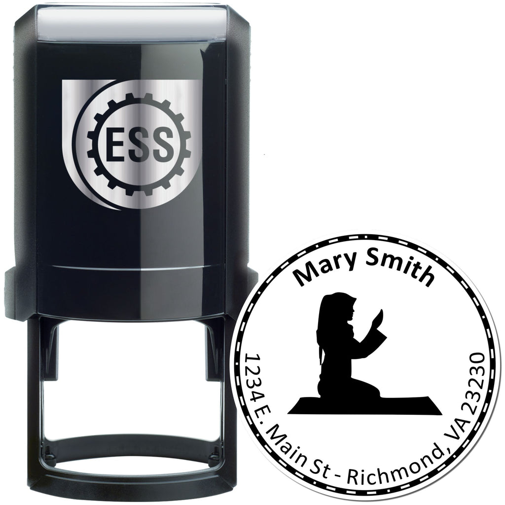 Elevate your correspondence with our Self-Inking Morning Prayers Return Address Stamp! This beautifully designed stamp features a serene image of a girl kneeling in prayer, surrounded by a charming solid circle border adorned with white dashes and dots. With your name elegantly displayed in the top arc and your address or a special saying at the bottom, this stamp is not just functional—it's a personal touch that transforms your mail into a heartfelt message. Measuring 1-5/8" in diameter, it’s the perfect size for all your stamping needs!