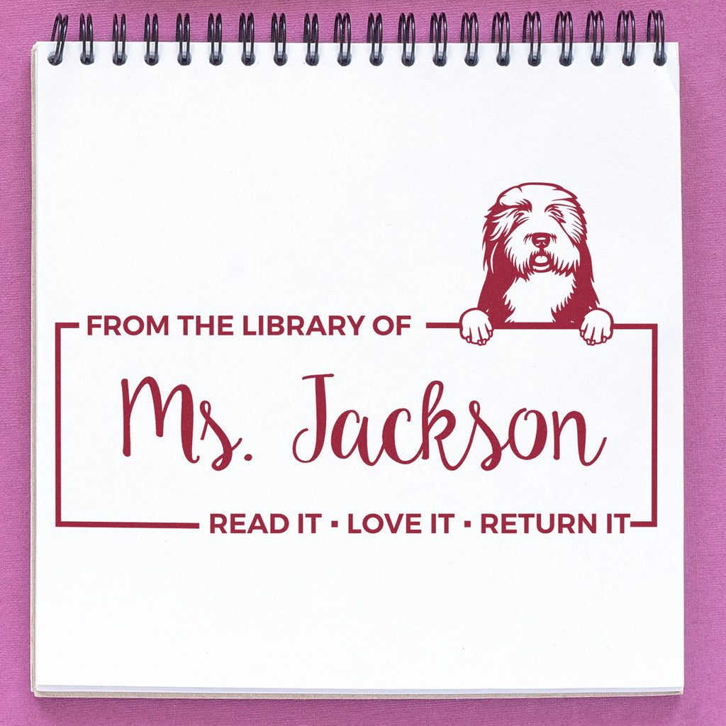 Keywords: Customized Custom Pet Book Read It Return Stamp, Personalizable Custom Dog Book Read It Return It Stamp, Old English Sheepdog Stamp.
