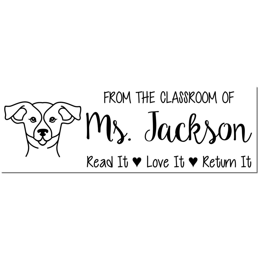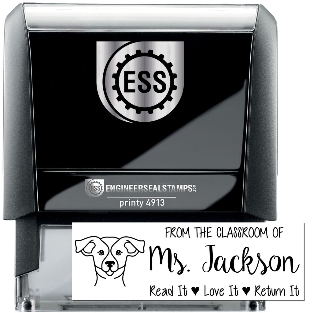 - CLASSROOM ORGANIZATION MADE EASY: Self-inking stamp measures 7/8" x 2-1/4" for perfect impressions every time. Features charming Russell Dog design with customizable text for instant book identification. Includes "Read it, Love it, Return it" message.