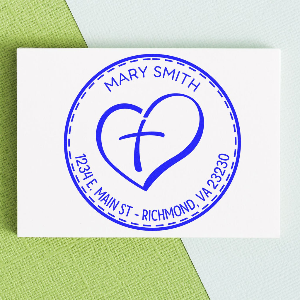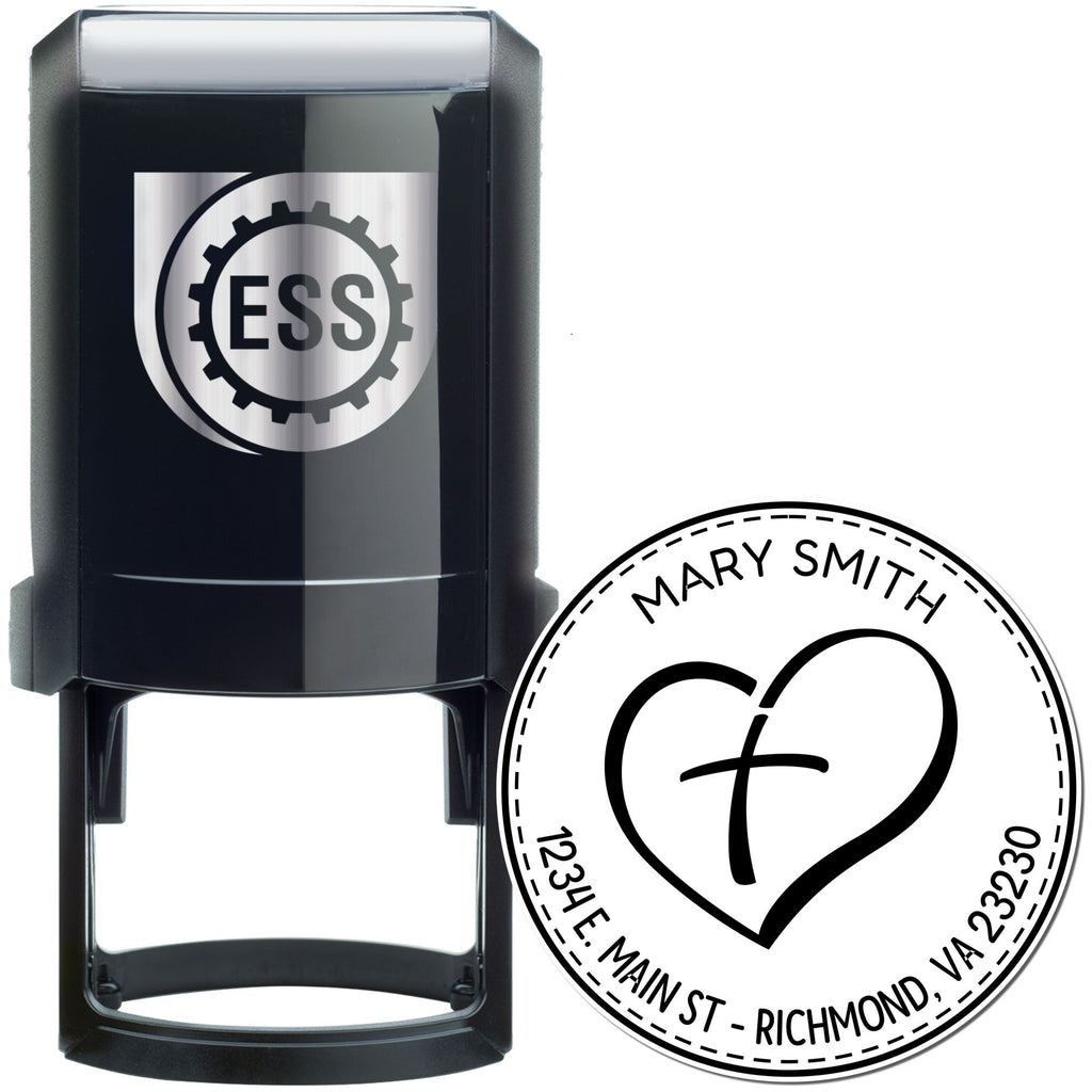 Introducing the Self-Inking Pious Heart Address Stamp – a beautiful blend of functionality and faith! This custom-made name and address stamper features a stunning Pious Heart design, complete with a cross at its center, making it the perfect addition to your correspondence. With a diameter of 1-5/8", this stamp is designed to leave a clear, professional impression every time, whether you're sending out wedding invites, business mail, or personal letters.