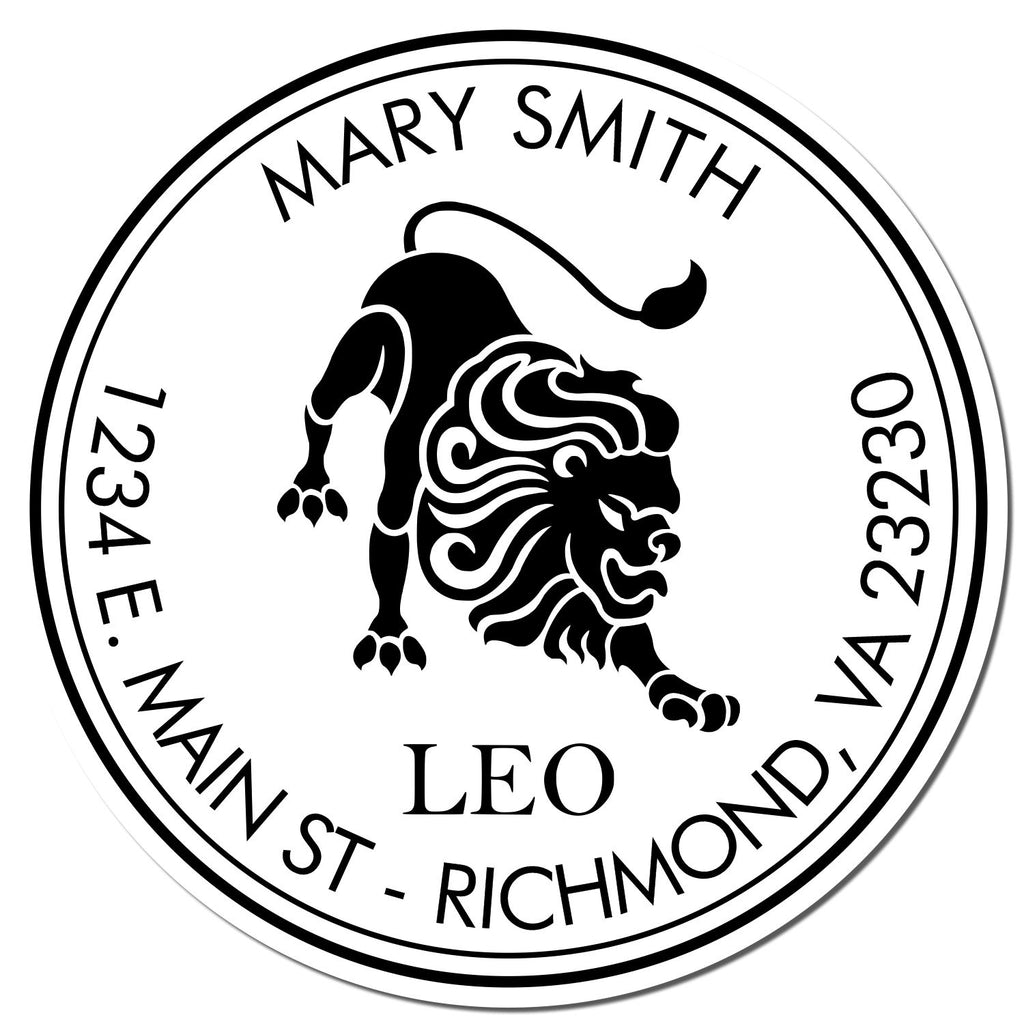 Featuring a striking Pouncing Leo lion design, this custom address stamper boasts a double concentric solid circular border that elegantly frames your name at the top and your address at the bottom. With an impression size of 1-5/8" in diameter, it’s the perfect size for all your correspondence. Choose from 11 vibrant ink colors to personalize your stamp and match your unique style or color-coding system, ensuring that every piece of mail stands out!