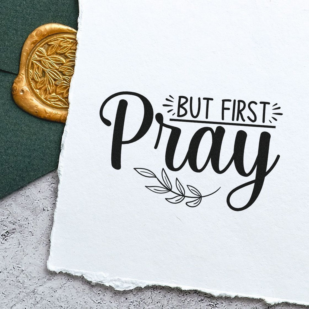 Every impression showcases a graceful, hand-lettered “But First Pray” in rich, elegant script, set against a clean layout with a horizontal rule, soft radiating accents, and a delicate leafy branch that adds a peaceful, organic feel. At 1-5/8" square, it’s the perfect size to stand out on your prayer lists, devotionals, sermon notes, gratitude logs, and memory verse pages—subtle enough to complement your layouts, yet bold enough to anchor your reflections.