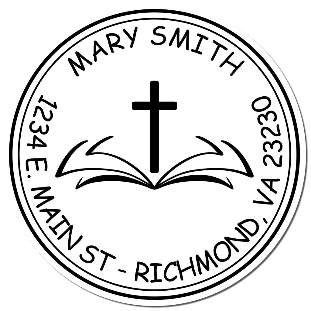 - ELEGANT RELIGIOUS DESIGN: Showcase your faith with a beautifully crafted cross and open bible centerpiece, surrounded by double concentric circular borders that frame your custom name and address perfectly.