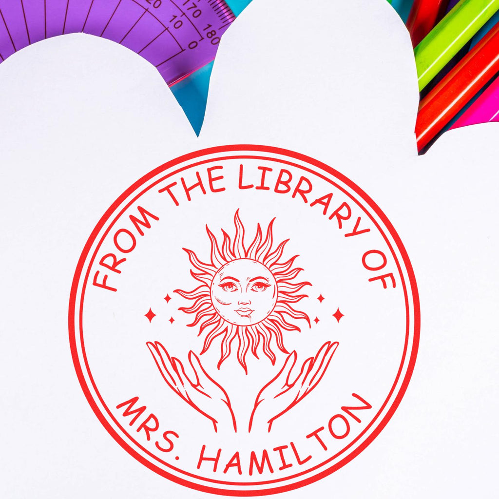 Introducing the Self-Inking Resplendent Sun Customized Bookplate Stamp – your new favorite tool for personalizing your cherished book collection! This exquisite stamp features a delightful design of a smiling Resplendent Sun cradled by two hands, surrounded by the elegant words "From The Library of" and "Read it, Love it, Return it". With a perfect impression size of 1-5/8" in diameter, this stamp not only marks your ownership but also adds a touch of artistic flair to your books.