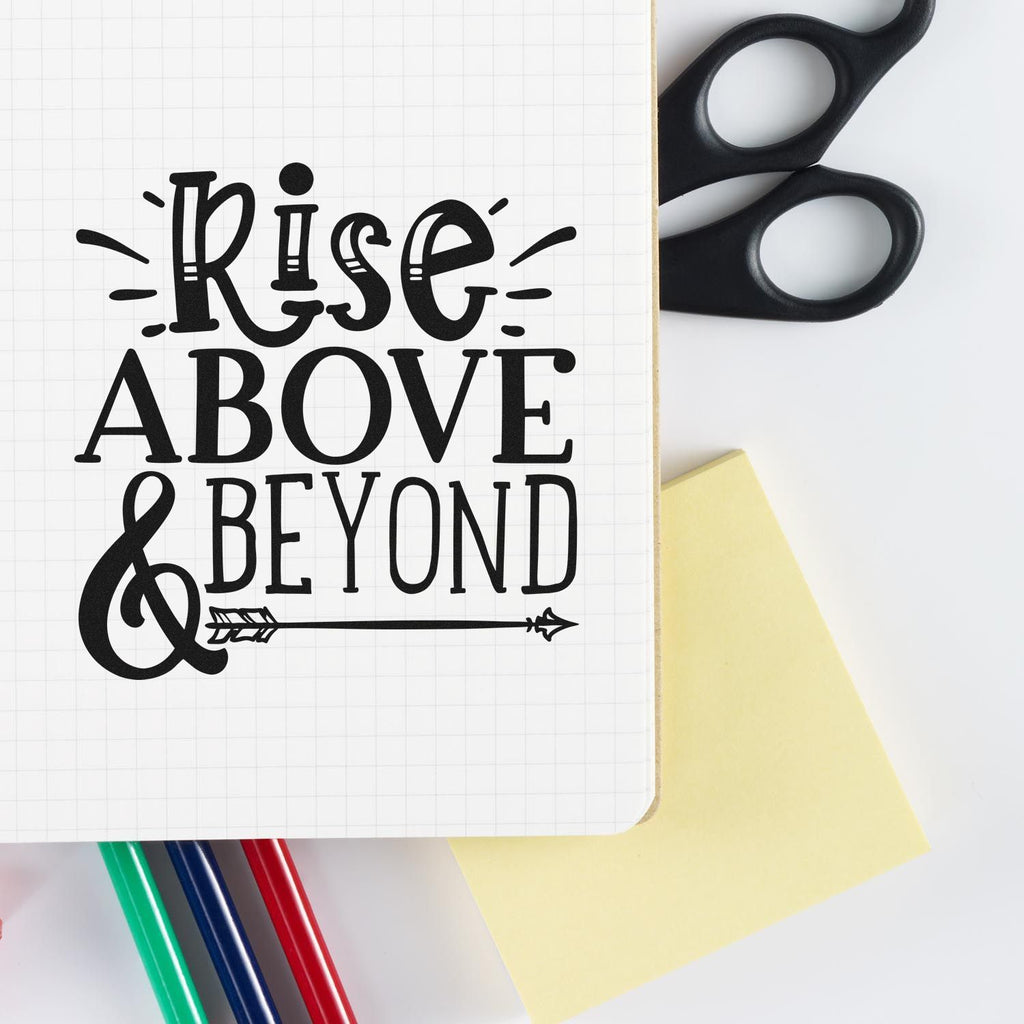 Tuck a spark of momentum into every moment with the Self-Inking Rise Above Mini Card Stamp—your pocket-ready push to aim higher and keep going. This 1-5/8 square stamp showcases a bold, hand-lettered “Rise Above” slogan that urges viewers to elevate and exceed expectations. Radiating lines and playful dots spotlight the central word, the ampersand subtly sings as a treble clef, and a sleek right-pointing arrow signals progress—an instant visual cue for ambition and action.