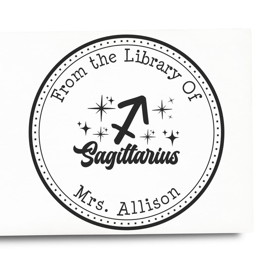 Self-Inking Sagittarius Zodiac Symbol with Scripted Font Custom Belongs To Stamper Highlights and Features