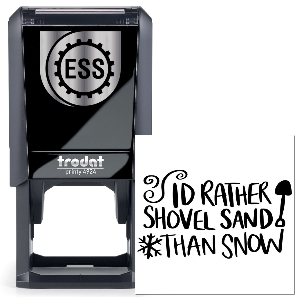 Freshly pressed personality for makers who mean it: our Self-Inking Sand Preference Papercraft Stamp brings a wink of sunshine to every page with “I’d rather shovel sand than snow,” hand-lettered in bold black script, a playful curl on the I’d, a tiny snowflake standing in for “than,” and a chic shovel icon to seal the smile. Sized at a versatile 1-5/8" square, it lands clean, centered, and ready to show off.