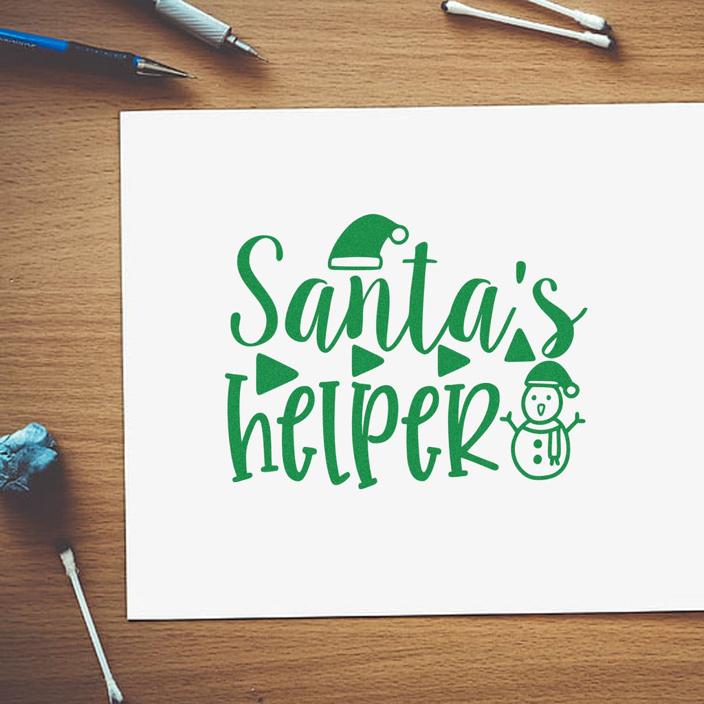 We designed this 1-5/8" square stamp with an eye-catching mix of flowing script and bold block type proudly spelling “Santa’s Helper,” while a scarf-clad snowman in a Santa hat gives a friendly wave. Tiny triangular accents sprinkle playful energy across every impression—perfect for place cards, name tags, gift exchanges, homework folders, and festive signs.