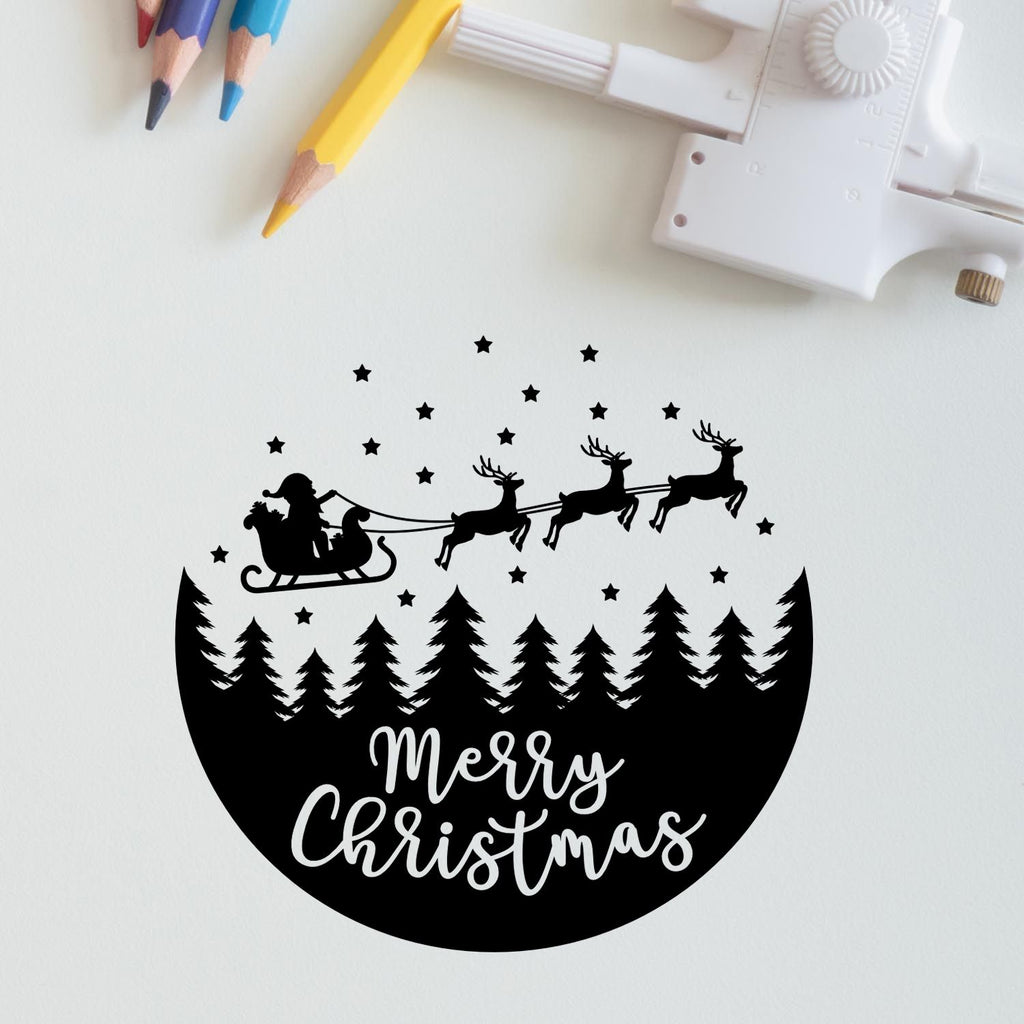 Imagine St. Nick gliding across a glittering winter sky, three nimble reindeer in tow, fir-lined hills unfurling below and a warm seasonal greeting curving at the base—your pages and cards suddenly alive with classic holiday charm. Our Sleigh Ride Self-Inking Stamp captures the nostalgia and wonder in a crisp 1-5/8" square impression that looks clean, chic, and wonderfully polished with every press.