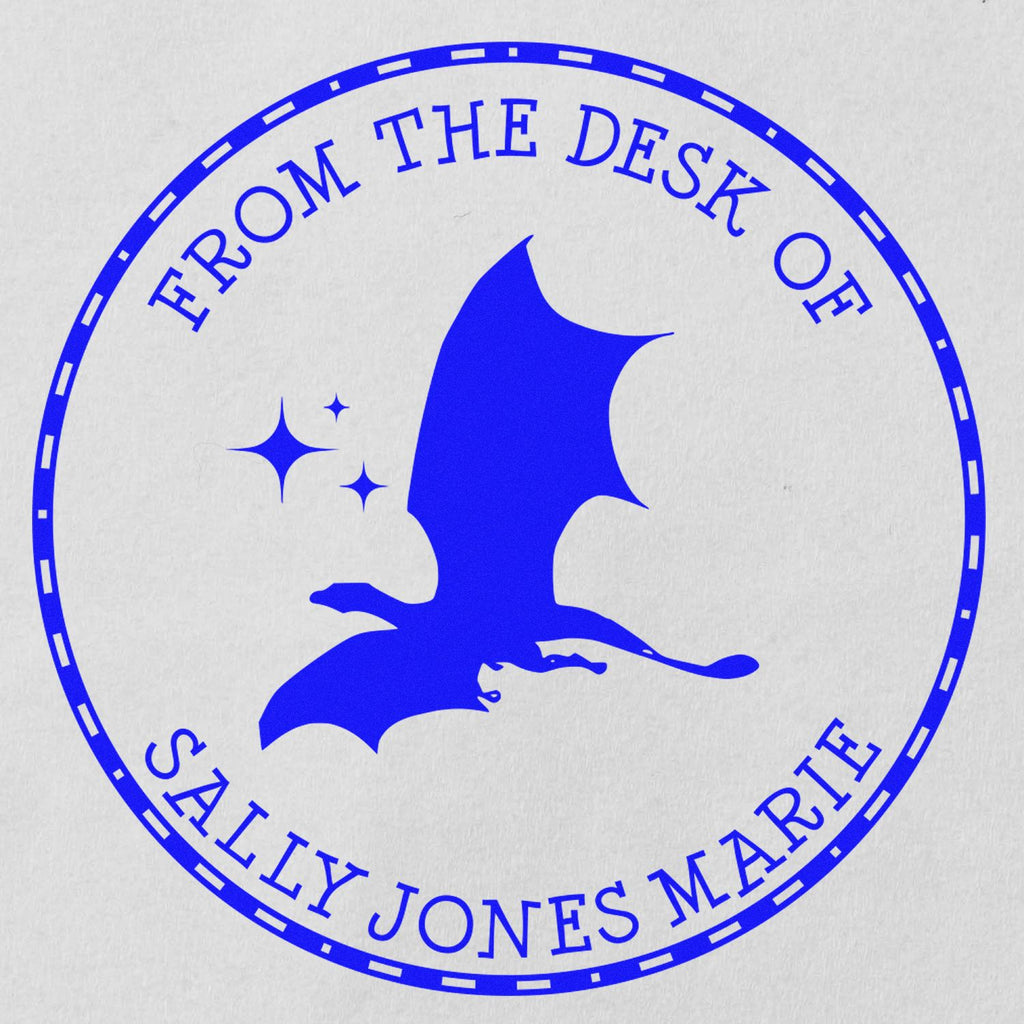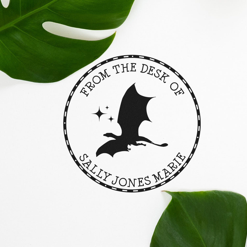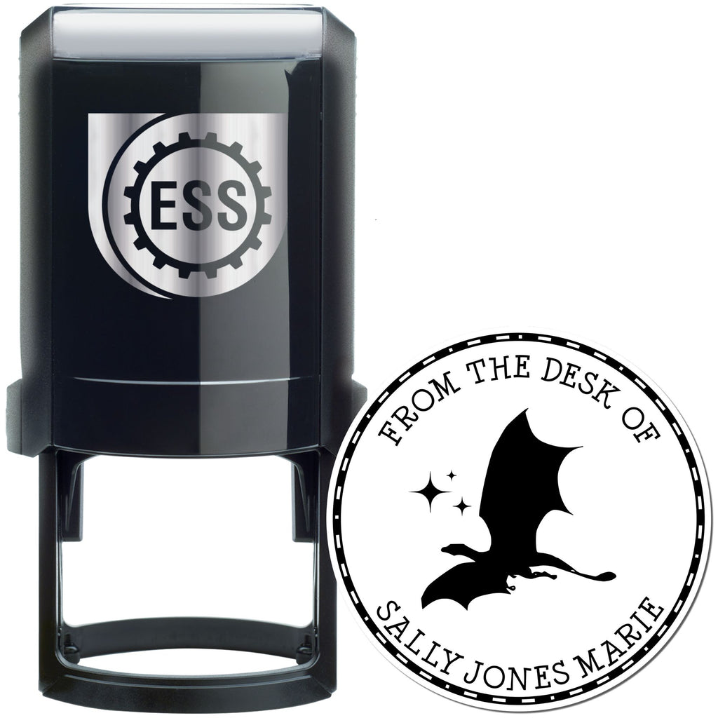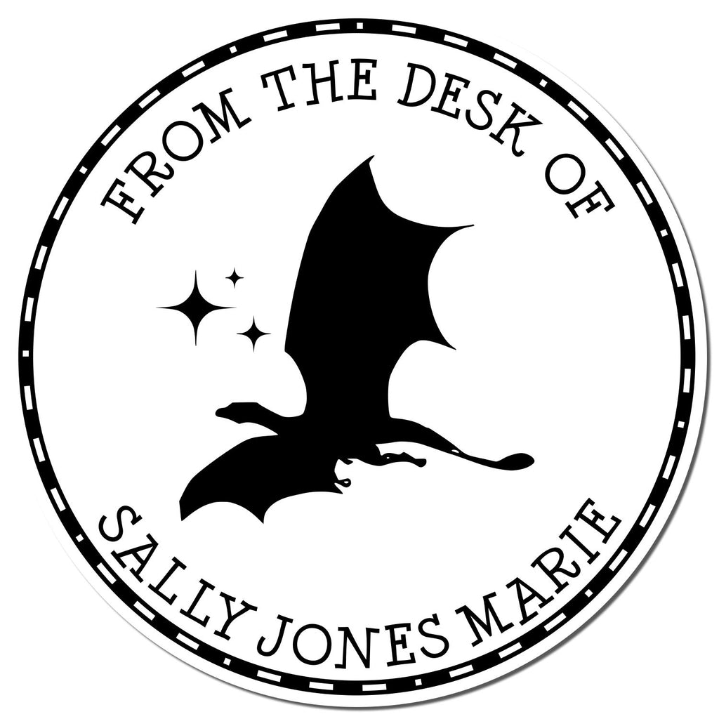 The design features a stunning Solar Flare Dragon at the center, surrounded by a charming solid circle border adorned with dashes and dots. The phrases "This Book Belongs To," "From The Library of," and "Ex Libris" elegantly frame your name or a personal saying, making each impression a work of art. Measuring 1-5/8" in diameter, this stamp is the perfect size for marking your beloved books, encouraging the return of borrowed items, and adding a classic touch to your collection.