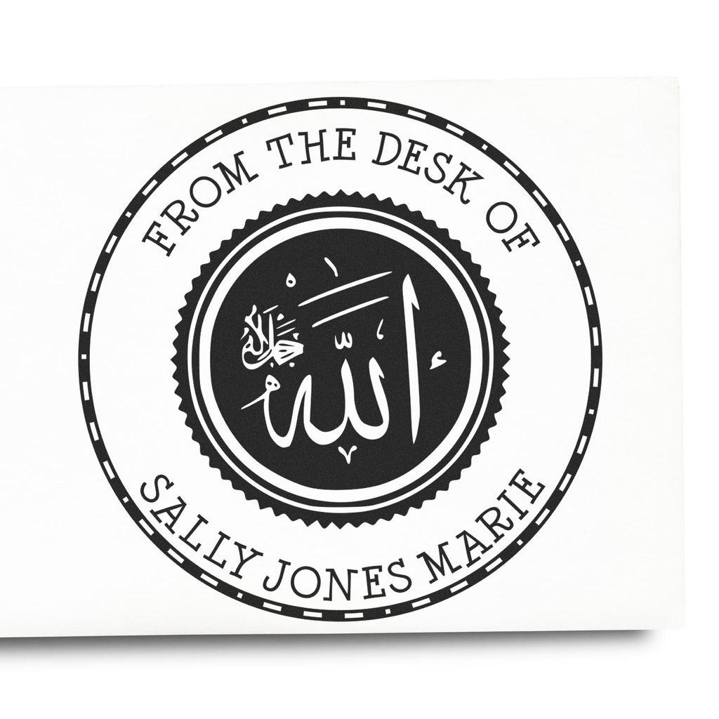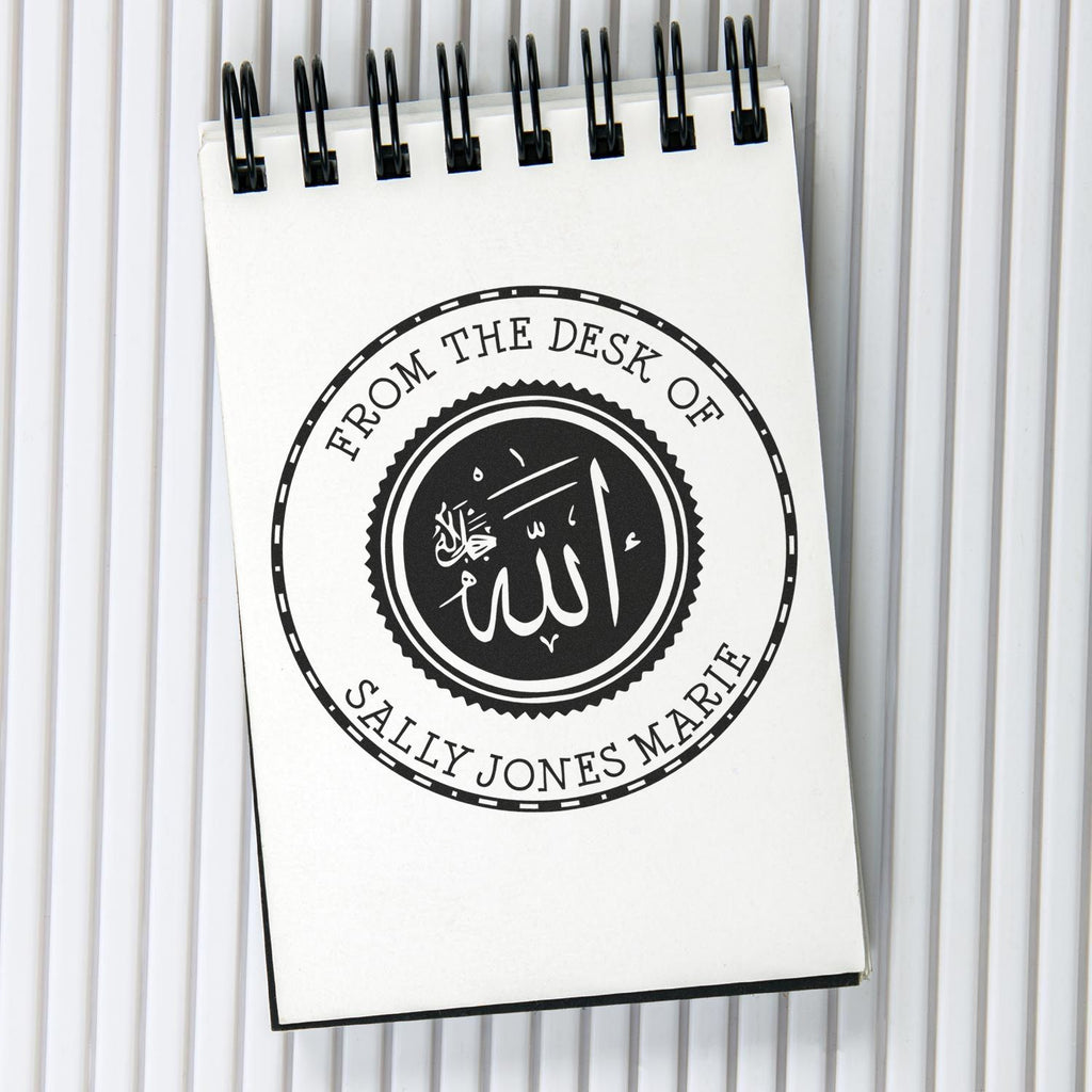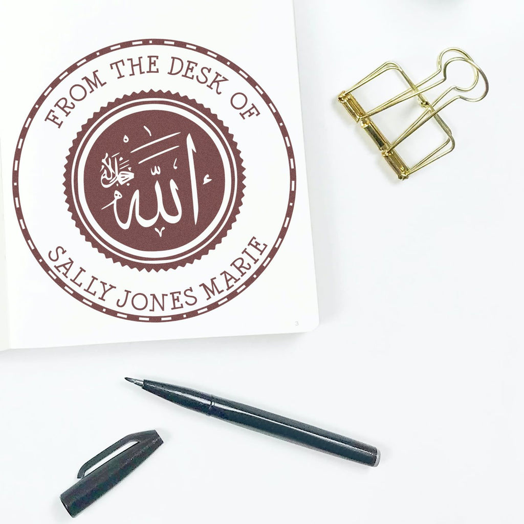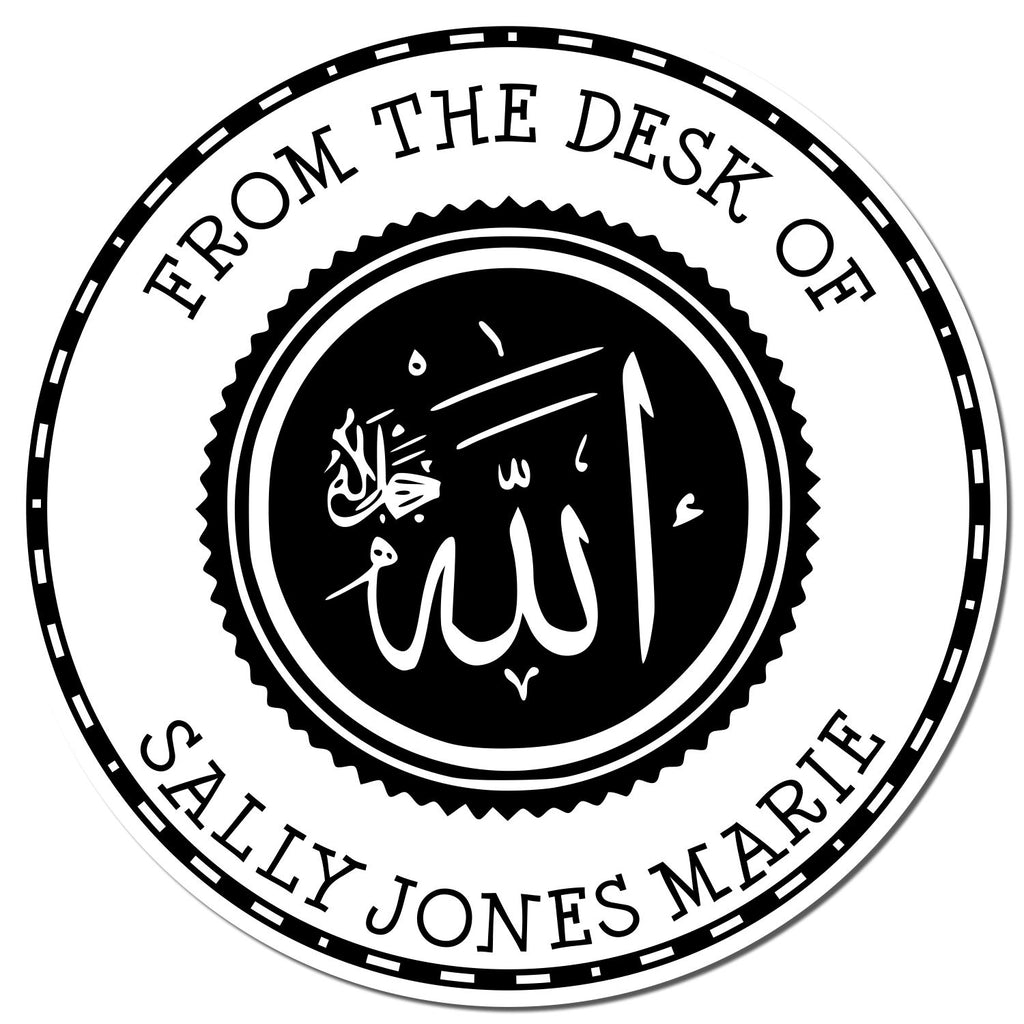 Elevate your home decor and personal correspondence with our exquisite Self-Inking Solemn Allah Custom Made Home Stamp! This beautifully designed stamp features a stunning center image of the Solemn Allah text, surrounded by a chic solid circle border adorned with elegant white dashes and dots. With customizable phrases like "This Book Belongs To" and "From The Library of," you can add your name or a personal saying, making it a perfect addition to your Islamic home decor. Measuring 1-5/8" in diameter, this stamp is compact yet impactful, ensuring your impressions are both clear and professional every time you use it.