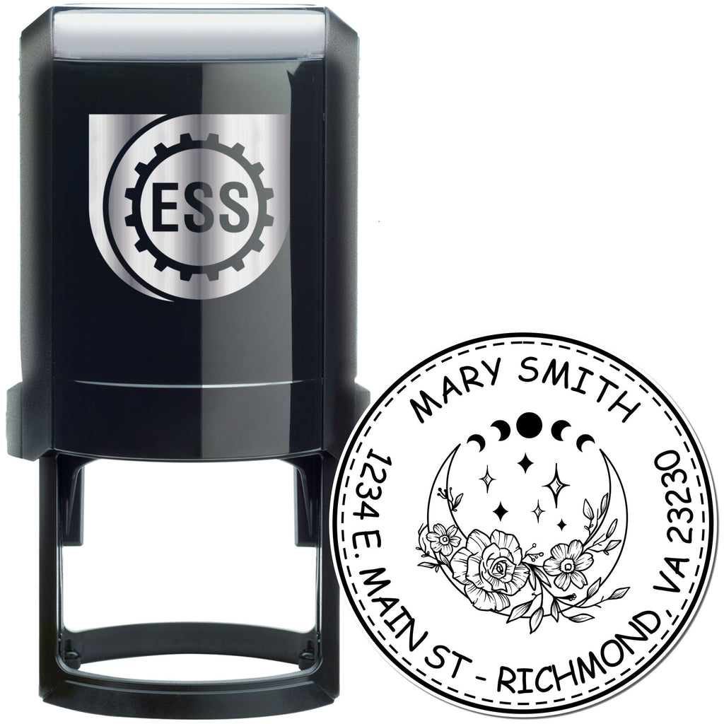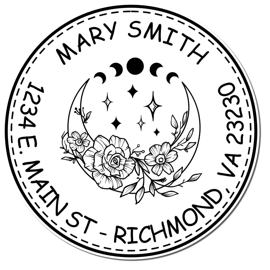 Featuring a beautiful Spiritual Sky design with a half moon, stars, and flowers, this address stamp not only performs beautifully but also adds a touch of style to your correspondence. The double ring circular border with your name and address ensures a professional look every time. Perfect for small business owners in the spiritual or wellness niche, this personalized mail stamp reflects your brand's ethos and connects with your audience.