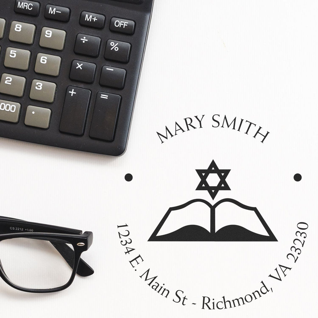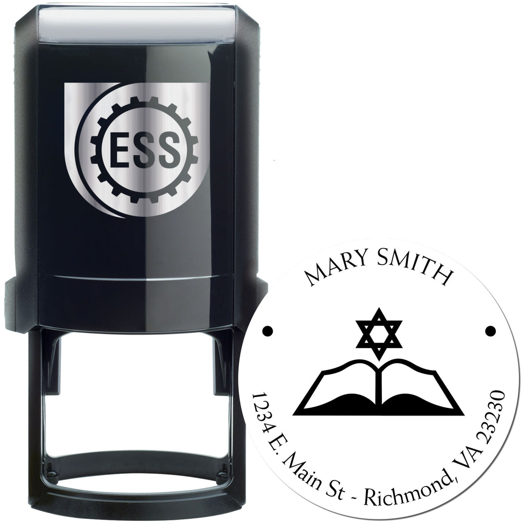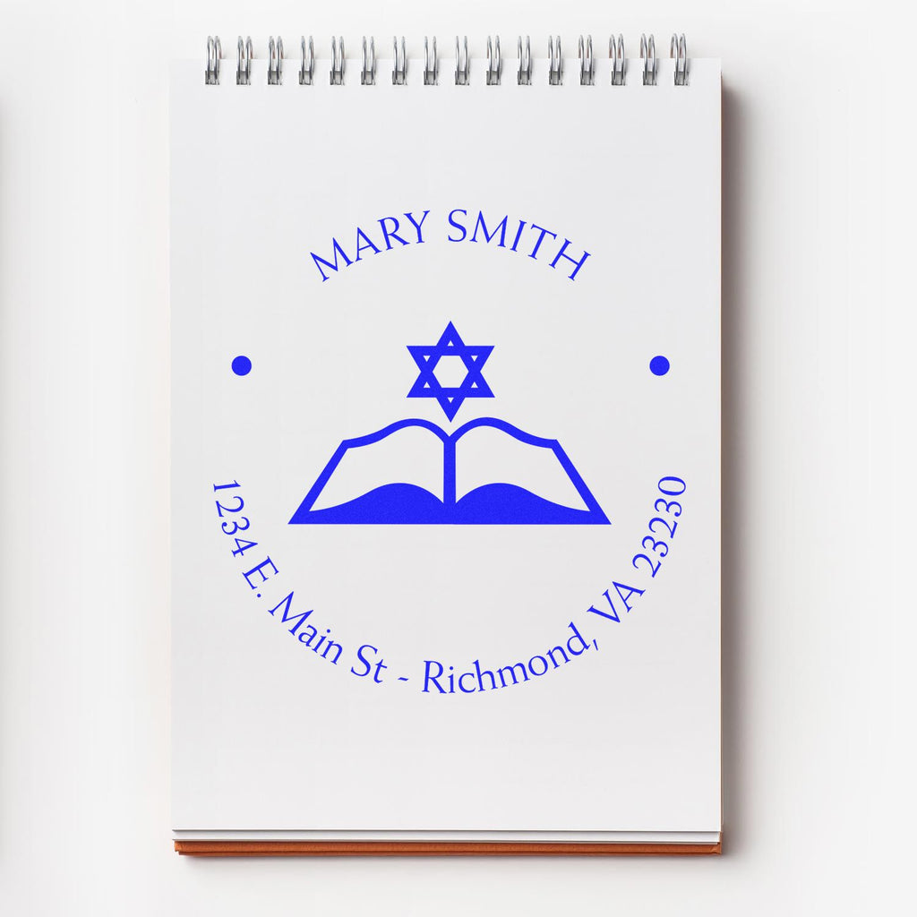 Introducing the Self-Inking Spiritual Words Custom New Home Stamper – the perfect way to add a personal touch to your new space! This unique address stamp features a beautifully designed center image of an open Torah and the Star of David, elegantly framed by your name and address in a clean round design. With an impression size of 1-5/8" in diameter, it’s the ideal tool for new homeowners looking to infuse their correspondence with spiritual inspiration.