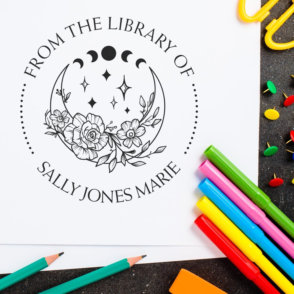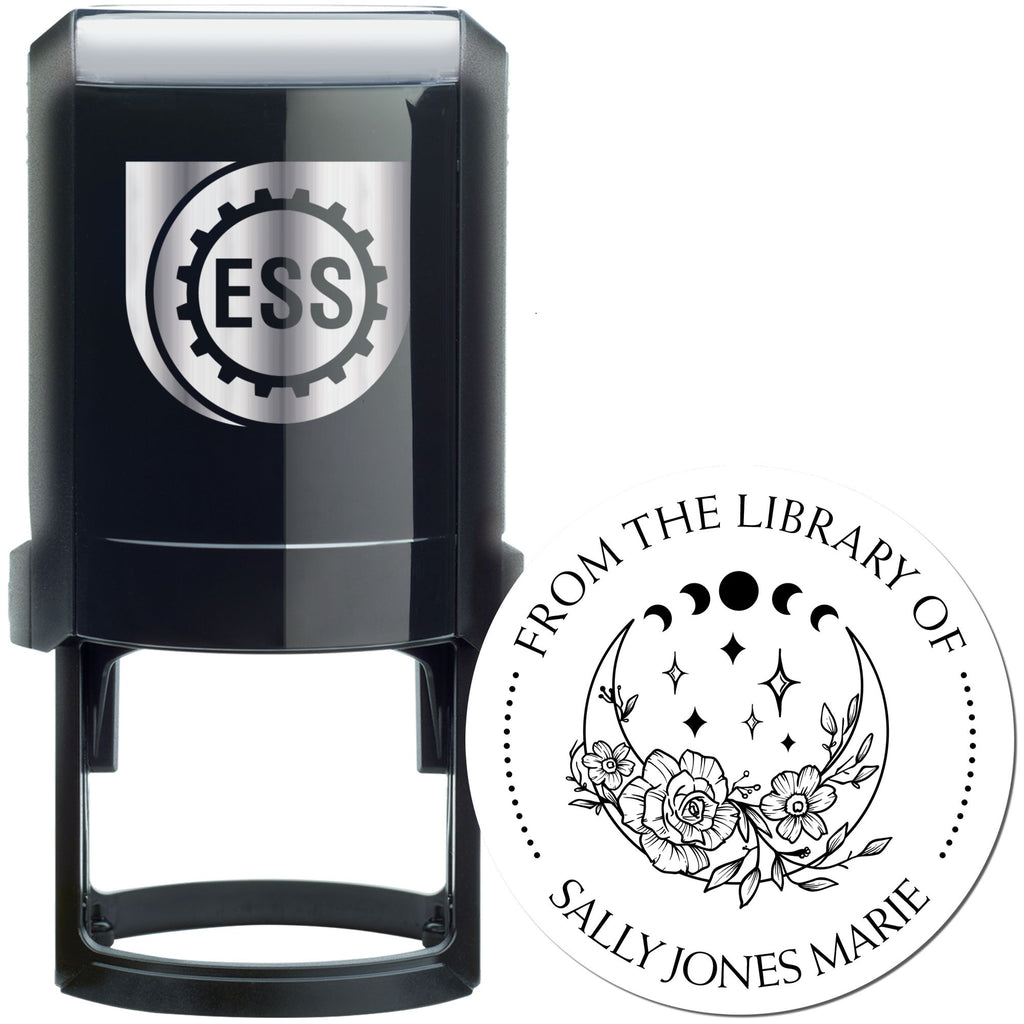 Featuring a stunning Sublime Celestial Half Moon design wrapped in floral elegance, this stamp measures 1-5/8" in diameter and includes phrases like "This Book Belongs To" and "From The Library of". Perfect for personal, school, or community libraries, it adds a unique touch that makes your books stand out and ensures they are easily identifiable.