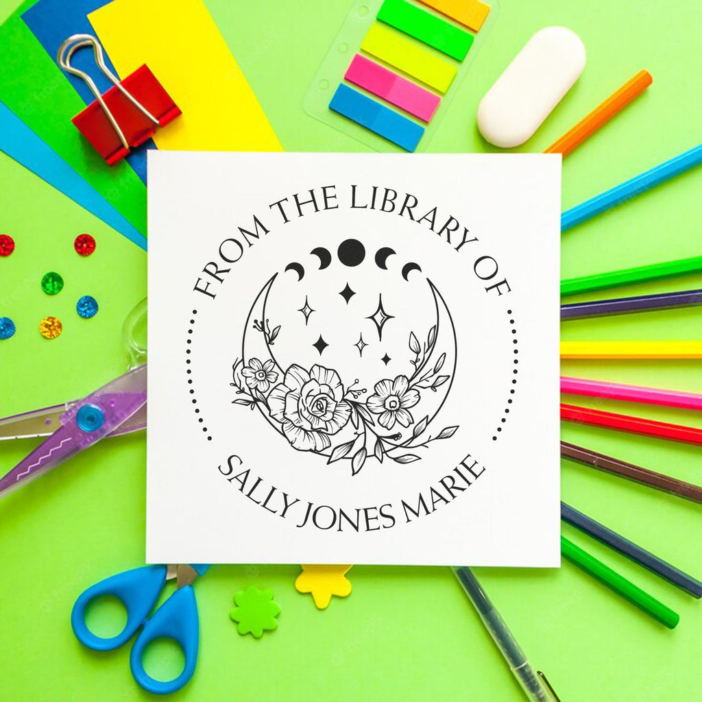 - PERSONALIZED ELEGANCE: Transform your library with our celestial moon design stamp, featuring custom text and intricate floral details. Perfect for marking ownership in style while protecting your cherished book collection. Laser-engraved for crisp, professional impressions every time.