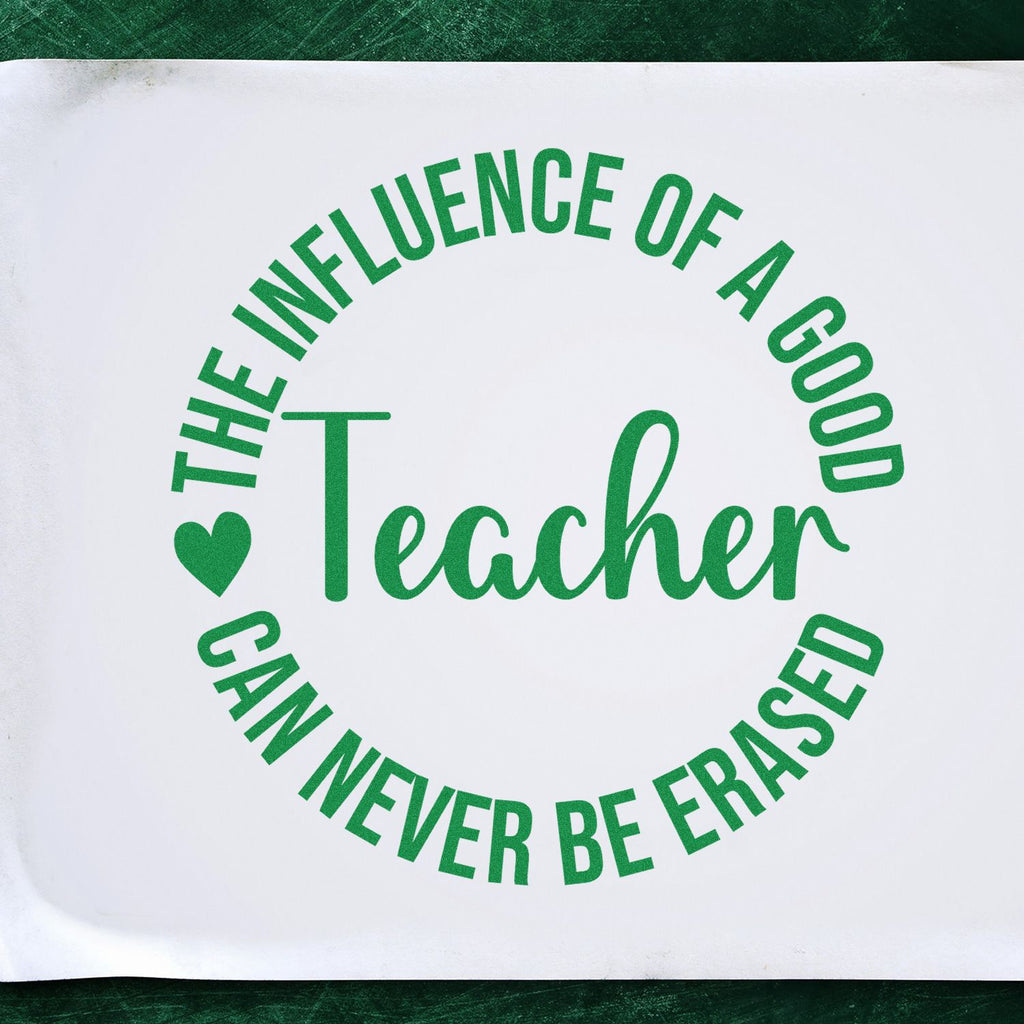 This striking black-and-white emblem puts “Teacher” front and center in flowing script, crowned by an arched motto that celebrates the lasting impact of great educators. A small solid heart near the word “Teacher” adds a warm, personal touch to every impression—perfect for transforming returned papers, reward charts, progress notes, and classroom keepsakes into tiny tokens of appreciation and pride.