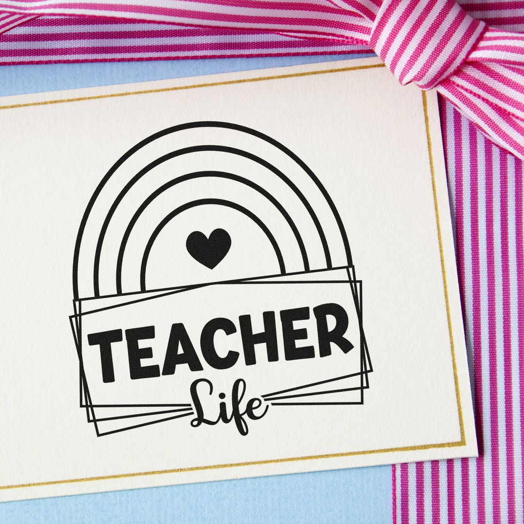 VSpark joy in every lesson with the Self-Inking “Teacher Life” Party Favor Stamp, designed to bring personality, pride, and a little celebration to everyday classroom moments. One gentle press reveals a bold black-and-white motif: five concentric rainbow arcs framing a strong heart at the center, with “TEACHER” in chunky block letters and a flowing “Life” script tying it all together—an instant statement of passion and purpose on every page.
