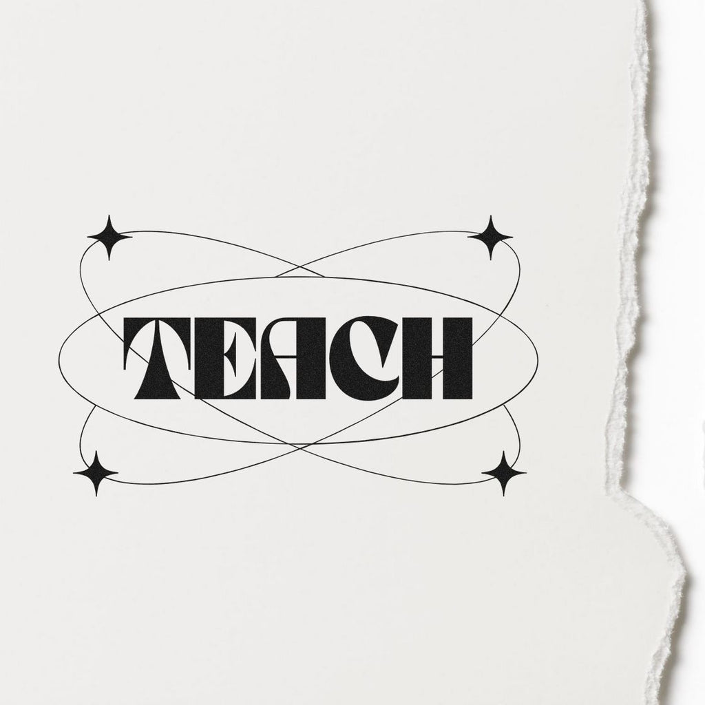 At its heart: TEACH, centered in bold black, framed by elegant orbiting arcs and sharp four-point stars that signal movement, connection, and forward-thinking energy. It’s modern, memorable, and instantly authoritative—perfect for work that inspires trust and fuels curiosity.