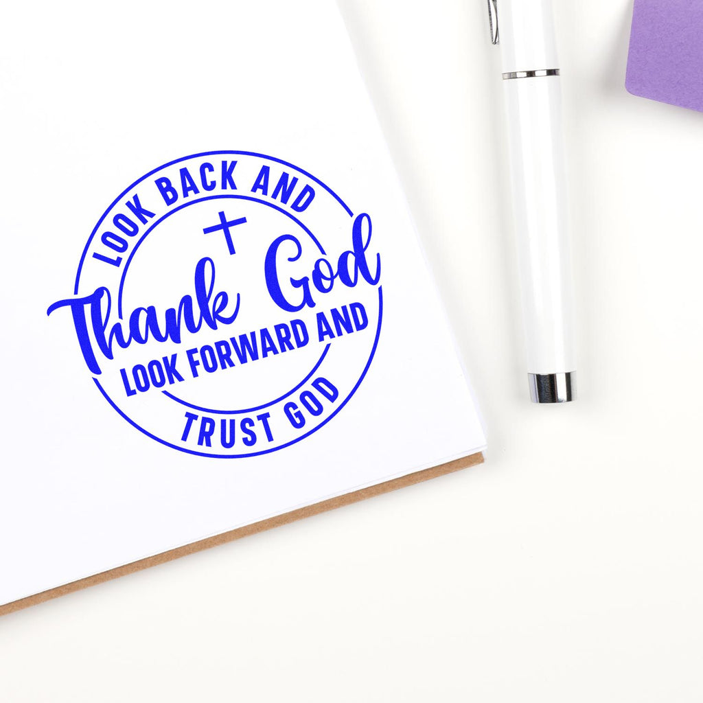 Radiate gratitude and bold faith in every piece of mail with our ESS Self-Inking “Thank God” Postcard Stamp, designed to turn ordinary postcards into powerful moments of reflection and hope. Centered on a striking cross and flowing “Thank God” script, this black-and-white emblem wraps your message in a timeless reminder: “Look back and” at God’s goodness, “Look forward and” “Trust God.” One press, and your postcards carry more than ink—they carry encouragement, testimony, and quiet joy.