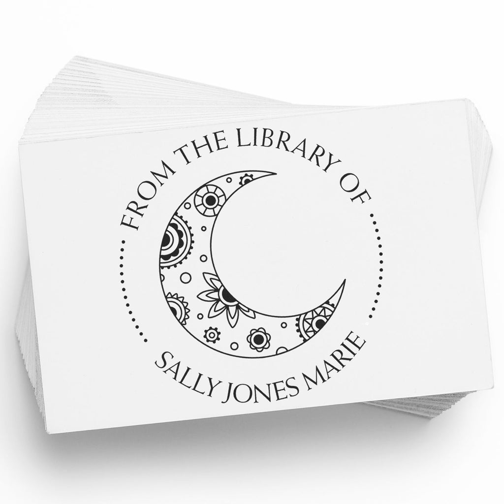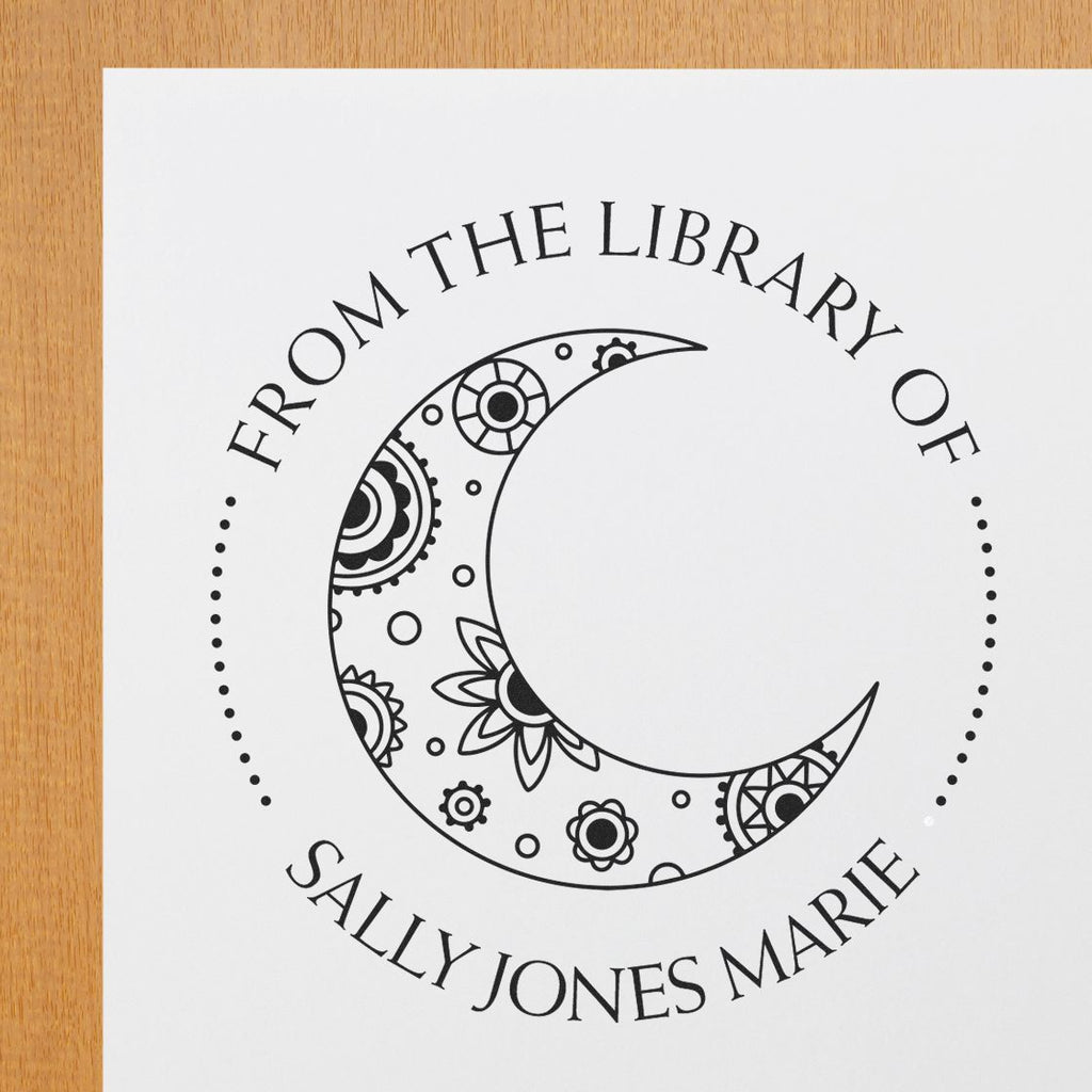 - ELEGANT WHIMSICAL DESIGN: Featuring a stunning moon with paisley details, customizable text arcs, and decorative dot separators that add sophistication to your personal library marking system.