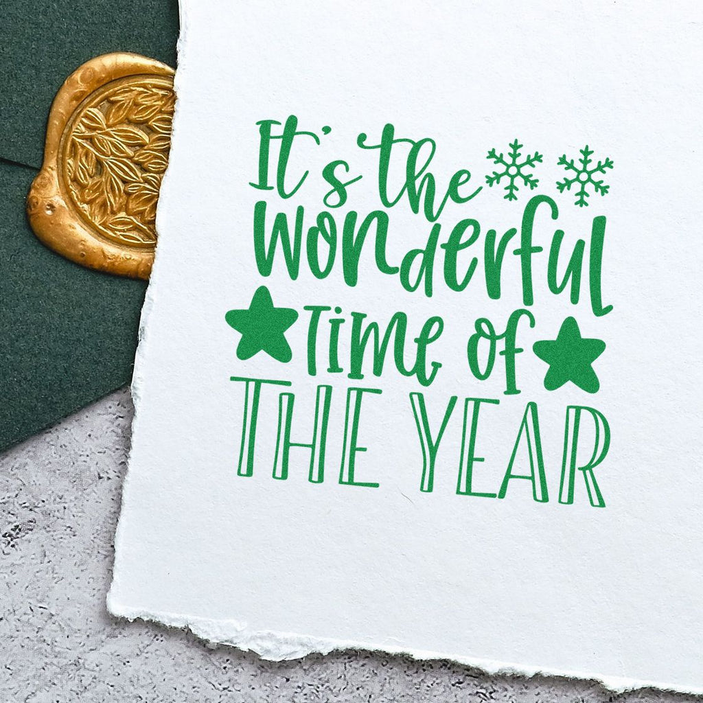 - Festive: Hand-lettered “It’s the wonderful time of the year” artwork, crowned with stylized snowflakes and star accents, delivers instant holiday charm that transforms ordinary mailers into memorable keepsakes.