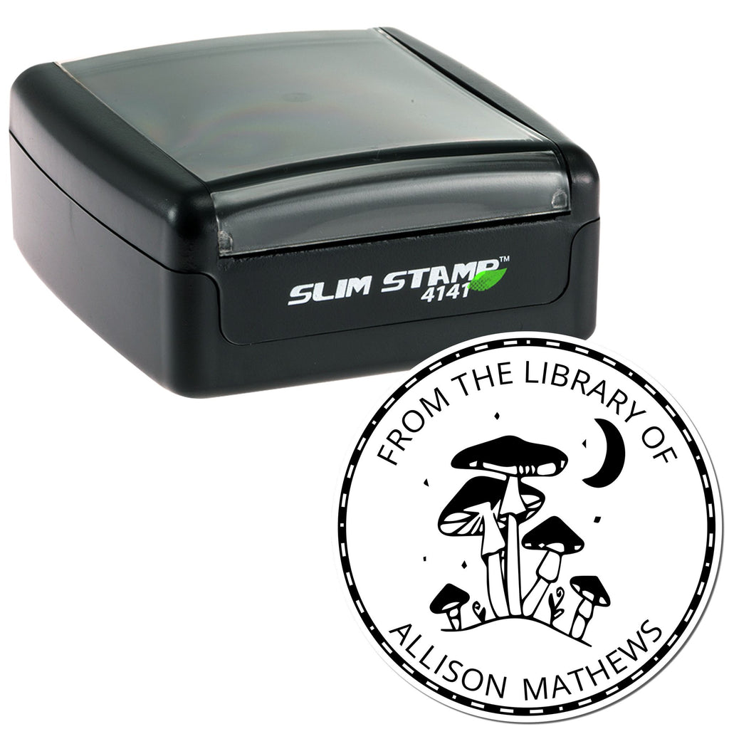 Transform your personal library into an organized sanctuary with this custom book identity stamp. The unique design features varying sizes of otherworldly mushrooms nestled on a gentle hill, complemented by a celestial crescent moon - perfect for those who appreciate the marriage of practical organization and mystical aesthetics.