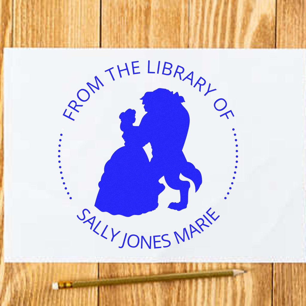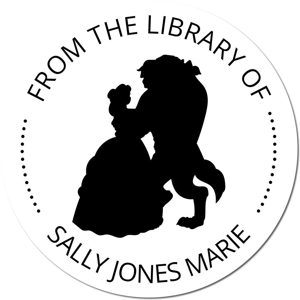 The stamp's beautiful design showcases an artistically rendered scene of a graceful woman in a flowing gown dancing with her beast partner, encircled by an elegant border. This whimsical touch adds a magical element that will delight your students while serving the practical purpose of identifying your books.