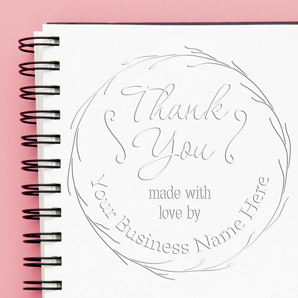 Perfect for small business owners, this 1-5/8" round embosser features a customizable design with "thank you" in beautiful writing, your business name, and "made with love by" surrounded by a leafy border. It's the ideal handmade birthday seal to show your customers how much you care, adding a personal touch to your products and packaging. It's like giving your business a big, warm hug!