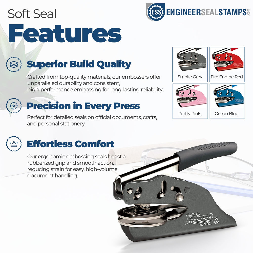 Crafted for ease and comfort, our soft seal embossers provide a sharp, raised look with minimal effort. The comfortable rubber grip ensures that your hand won’t tire, even after multiple uses. Whether you’re stamping official paperwork, creative projects, or personal stationery, you’ll achieve a perfect impression every time. Made from high-quality materials, this embosser is built to last, giving you reliable stamps over and over again. Choose from four stylish colors: smoke grey, fire engine red, pretty pink, and ocean blue!