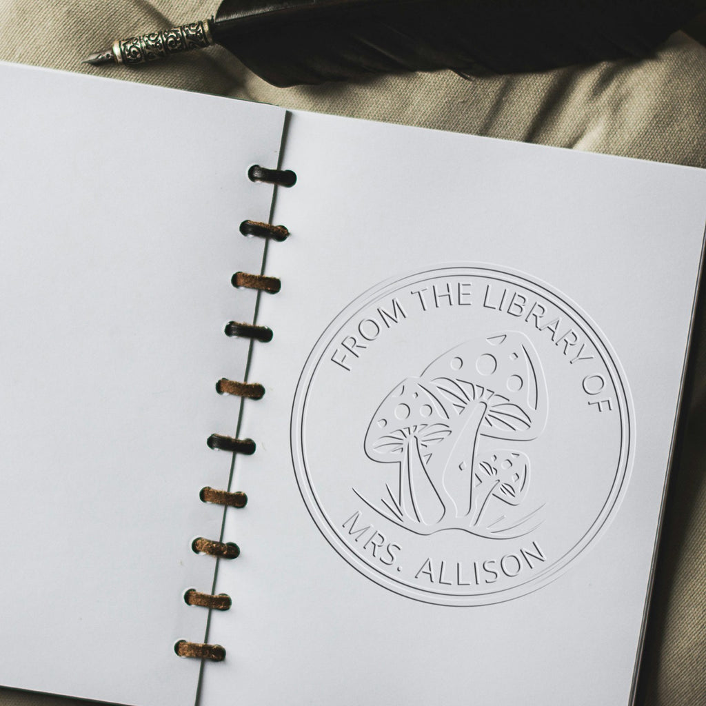 Keywords: custom bookplate seal, personalized ex libris art embossing seal, mushroom desk embosser, unique desk accessories, nature-inspired office decor.