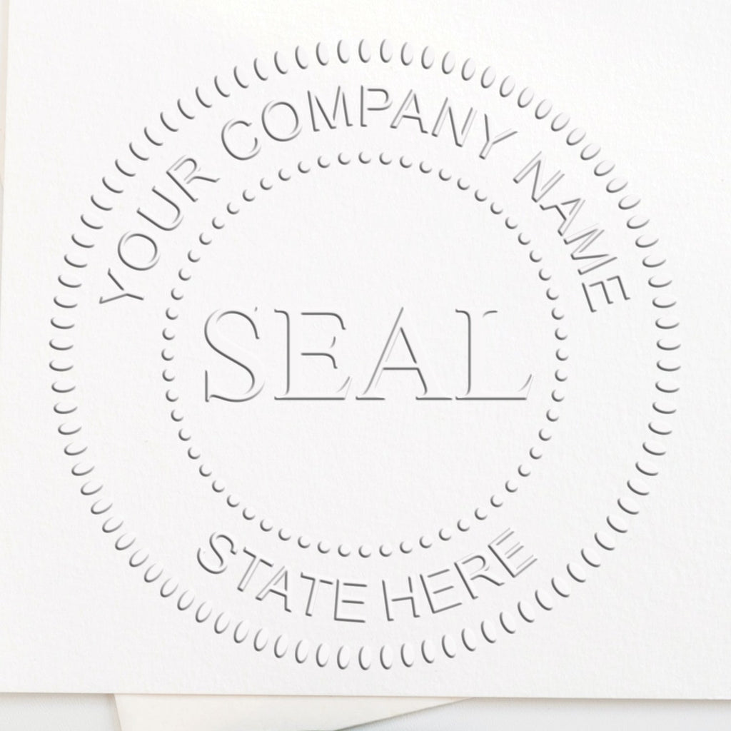 Specifications: - Size: 1-5/8" - Design: Circular layout with a dotted border, featuring "Your Company Name" curved along the top, "State Here" curved along the bottom, and the word "SEAL" prominently centered in bold capital letters. Clean, professional, and straightforward style.