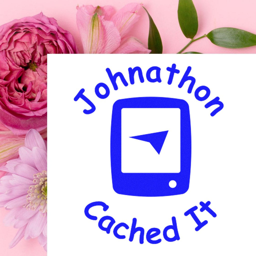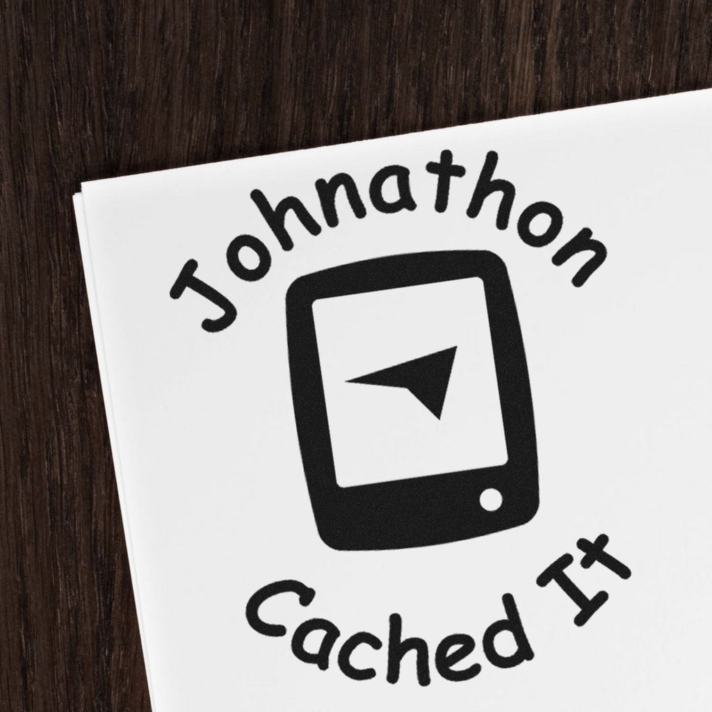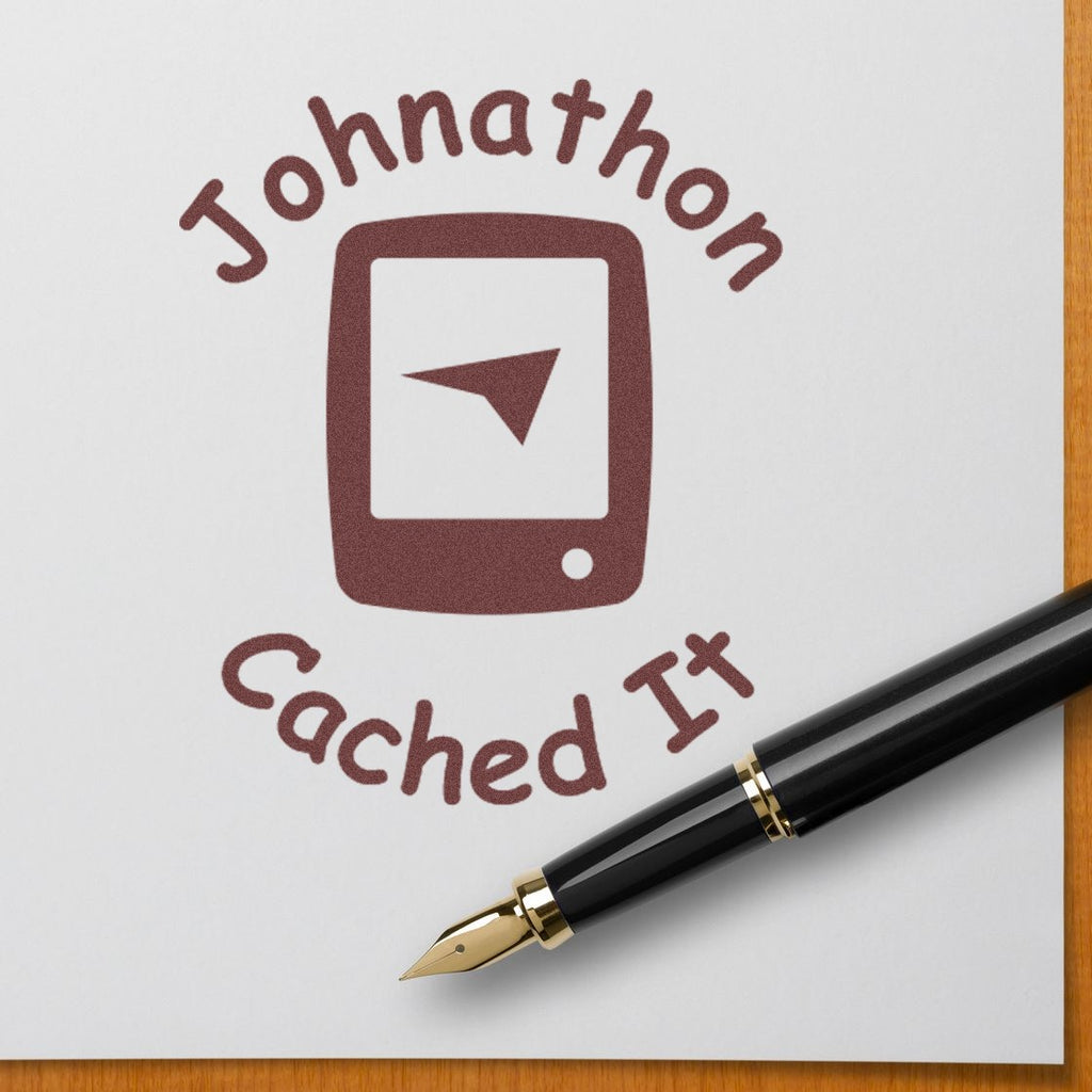 Designed specifically for tech-savvy geocachers, this custom stamp showcases a striking GPS device design with a directional arrow, surrounded by your personalized text in an eye-catching circular format. The laser-engraved rubber die ensures crisp, clear impressions every time, making your mark unmistakable in any cache logbook.