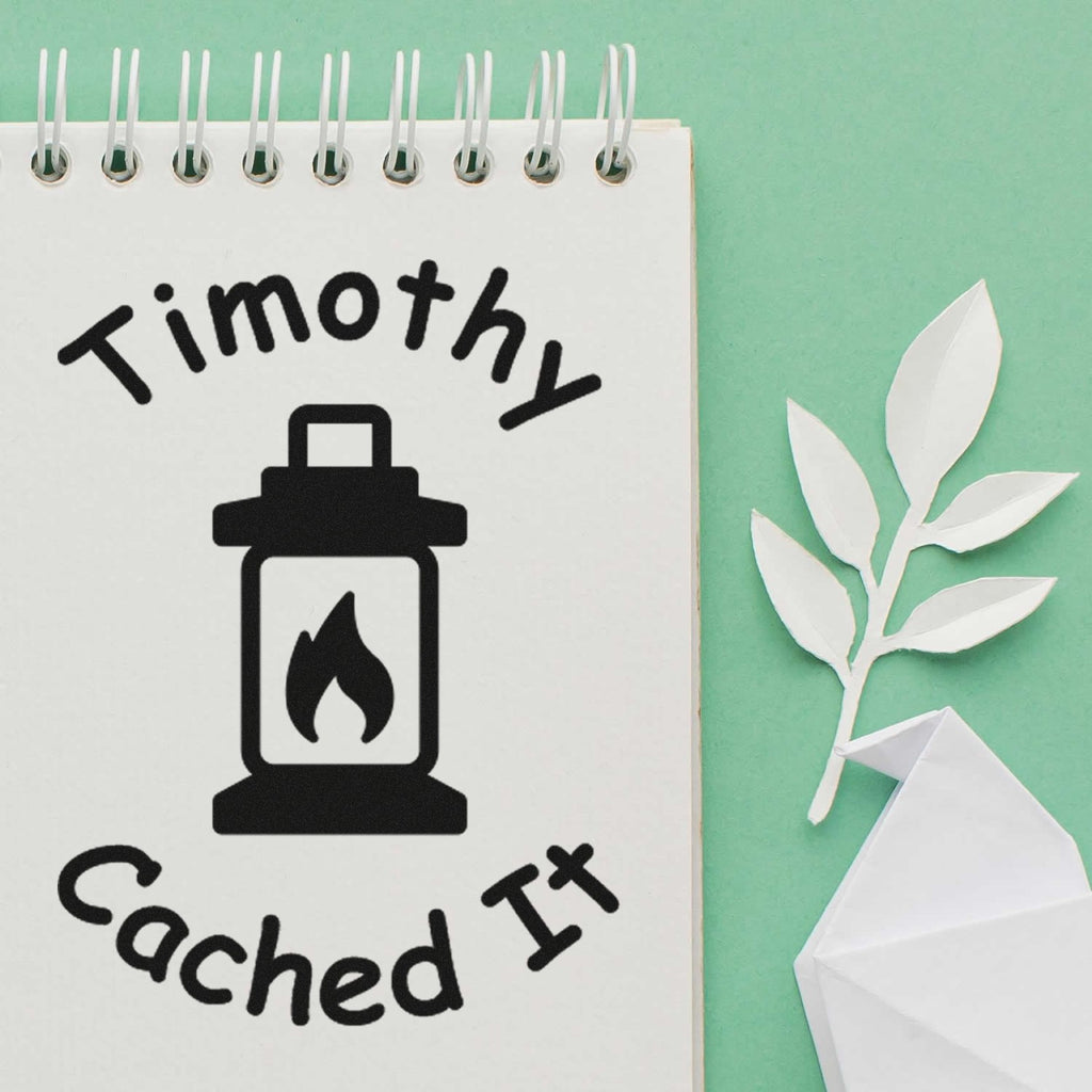 Crafted with precision, this 3/4" circular stamp features an elegant lantern design with a warm flame at its center, surrounded by your personalized text in a friendly, curved font. The comfortable black wooden handle provides excellent grip and control, making it ideal for quick logging during your cache-and-clean missions.